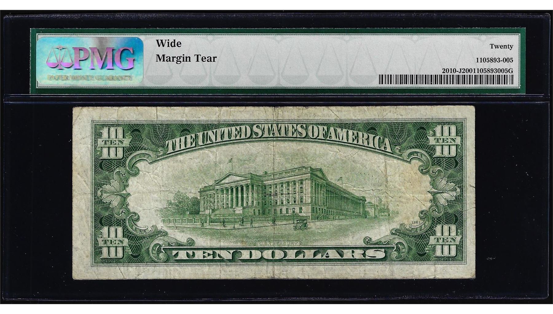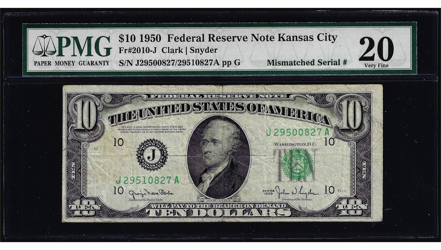 One 1950 $10 Federal Reserve Note Mismatched Serial Number Error Fr.2010-J PMG Very Fine 20. PMG Certified.