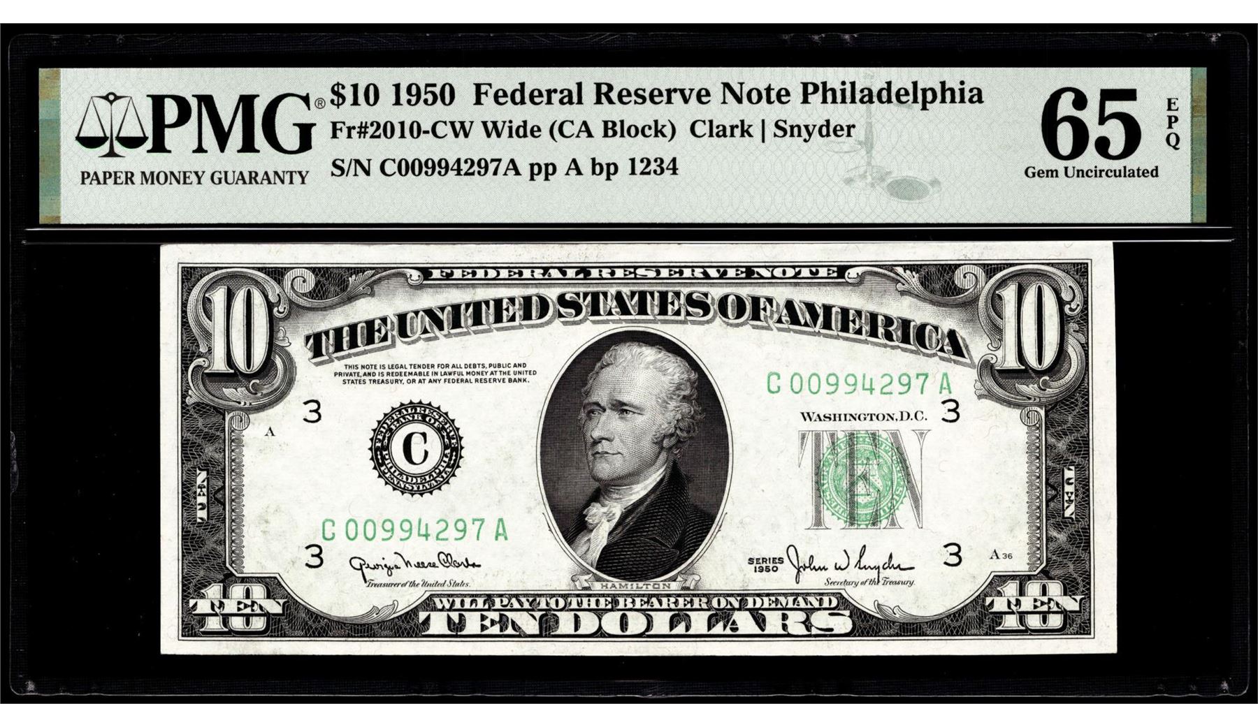 One 1950 $10 Federal Reserve Note Philadelphia Fr.2010-CW PMG Gem Uncirculated 65EPQ. PMG Certified.