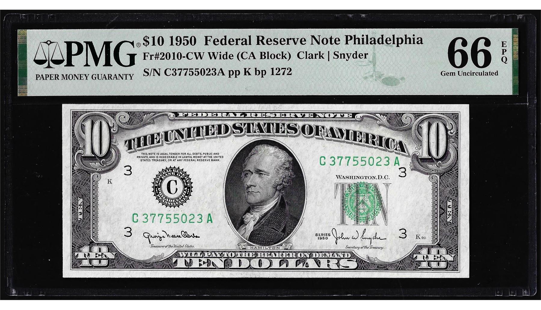 One 1950 $10 Federal Reserve Note Philadelphia Fr.2010-CW Wide PMG Gem Uncirculated 66EPQ. PMG Certified.