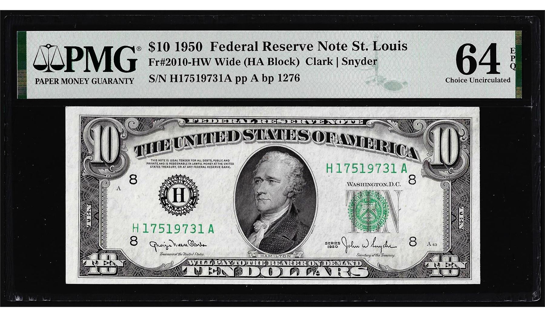 One 1950 $10 Federal Reserve Note St. Louis Fr.2010-HW PMG Choice Uncirculated 64EPQ. PMG Certified.