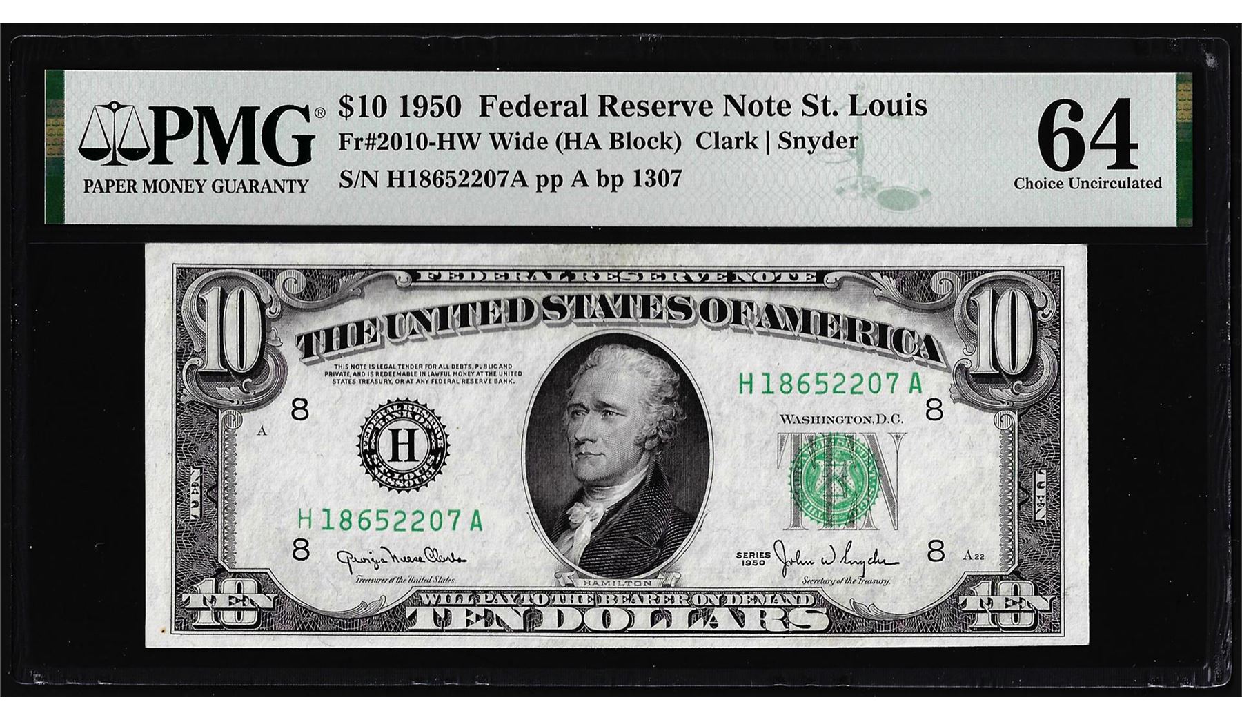 One 1950 $10 Federal Reserve Note St. Louis Fr.2010-HW PMG Choice Uncirculated 64EPQ. PMG Certified.
