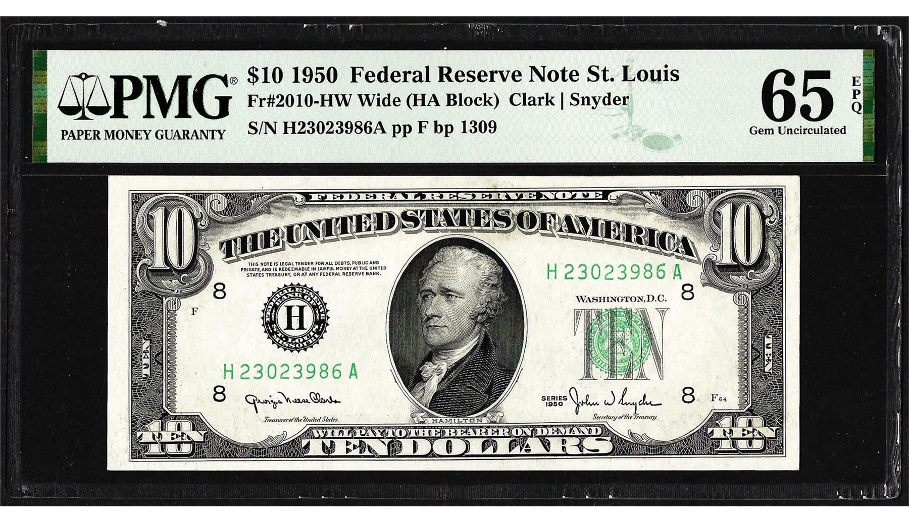 One 1950 $10 Federal Reserve Note St. Louis Fr.2010-HW PMG Gem Uncirculated 65EPQ. PMG Certified.