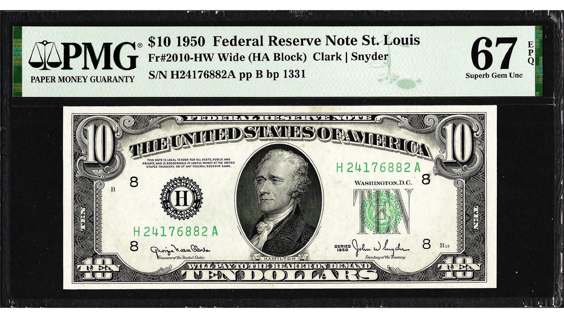 One 1950 $10 Federal Reserve Note St. Louis Fr.2010-HW PMG Superb Gem Uncirculated 67EPQ. PMG Certified.