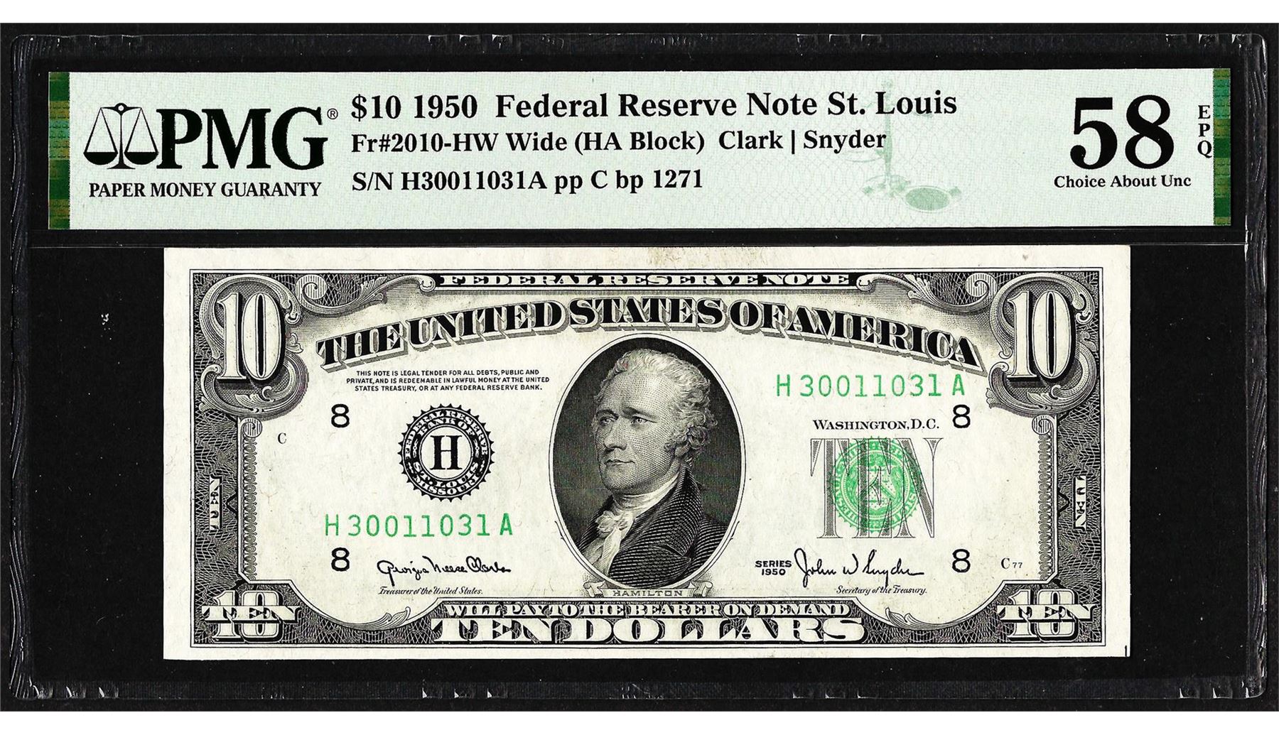 One 1950 $10 Federal Reserve Note St. Louis Fr.2010-HW Wide PMG About Uncirculated 58EPQ. PMG Certified.