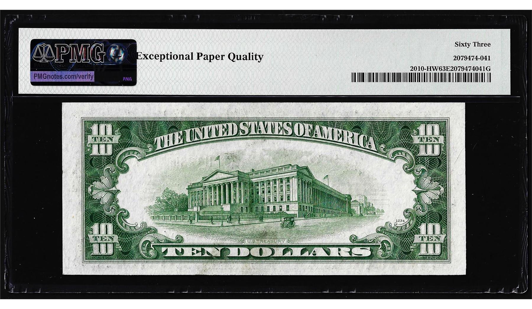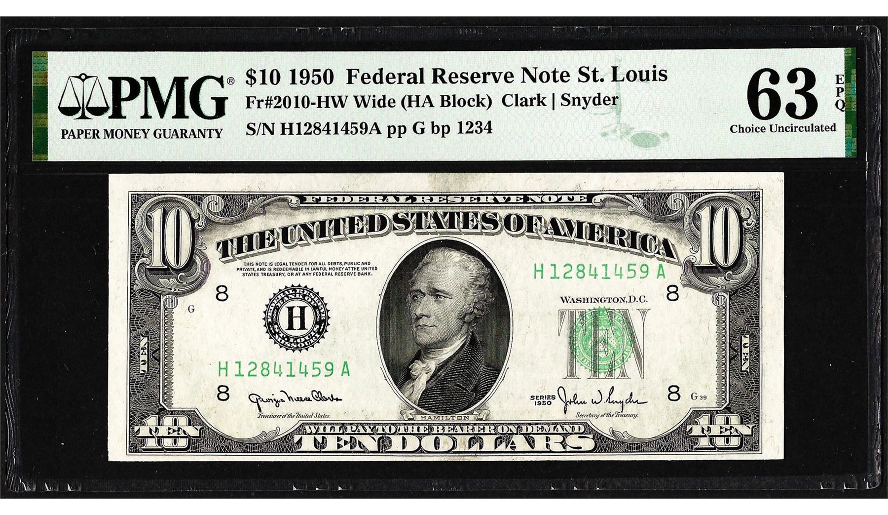 One 1950 $10 Federal Reserve Note St. Louis Fr.2010-HW Wide PMG Choice Uncirculated 63EPQ. PMG Certified.
