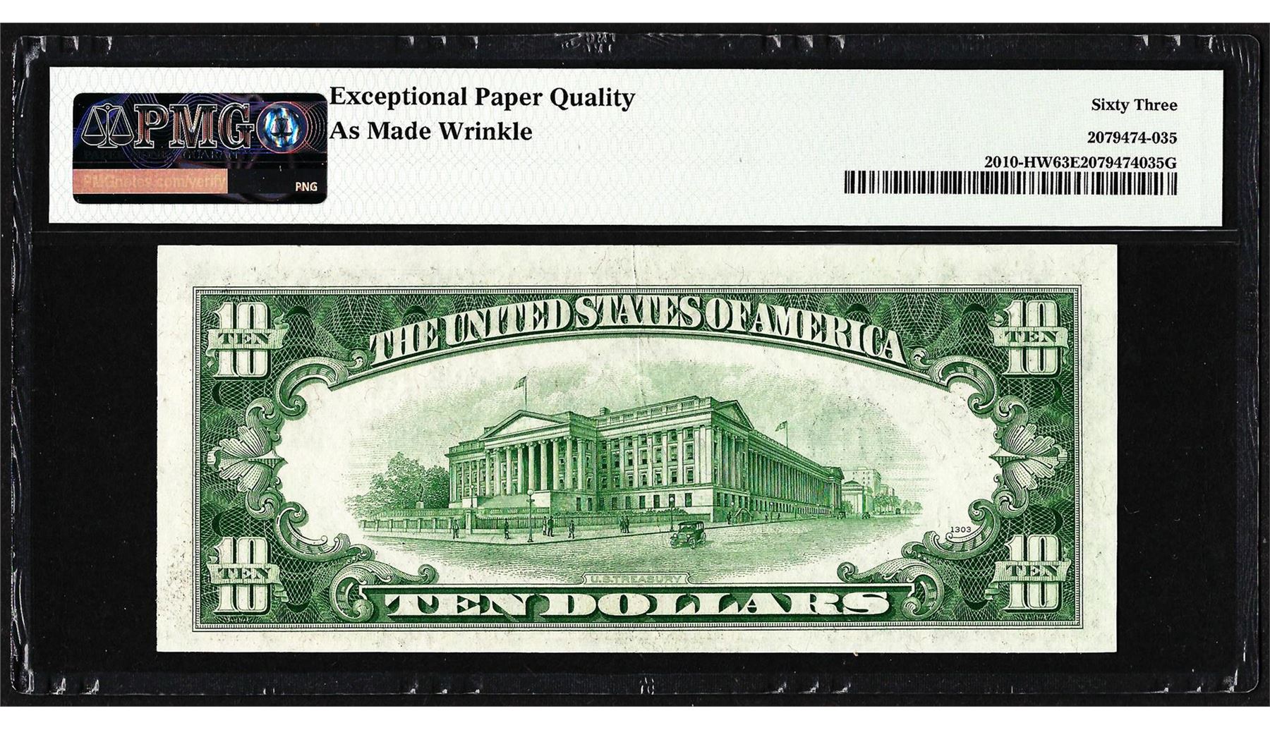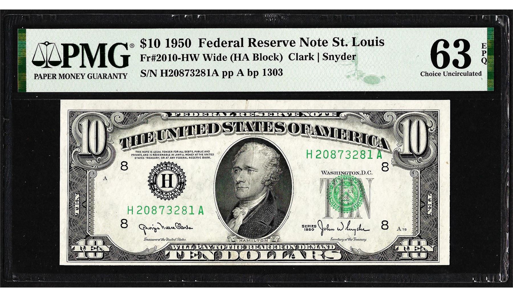 One 1950 $10 Federal Reserve Note St. Louis Fr.2010-HW Wide PMG Choice Uncirculated 63EPQ. PMG Certified.