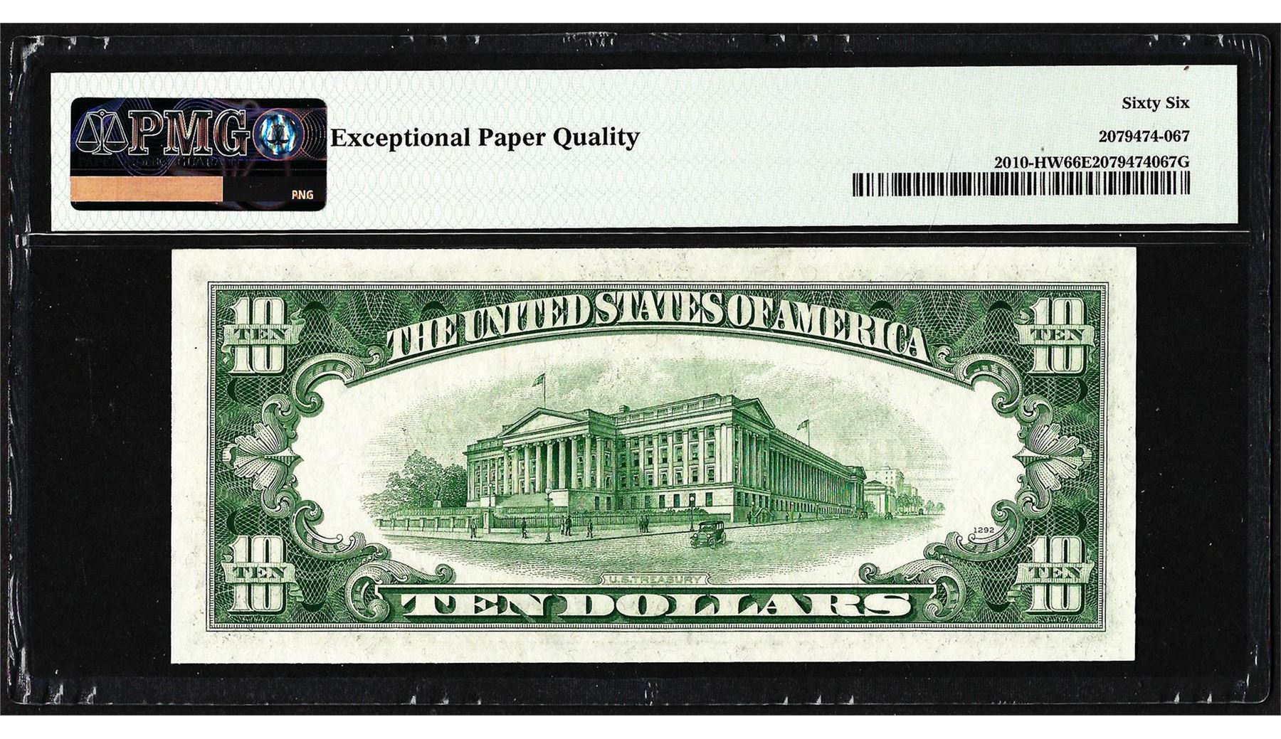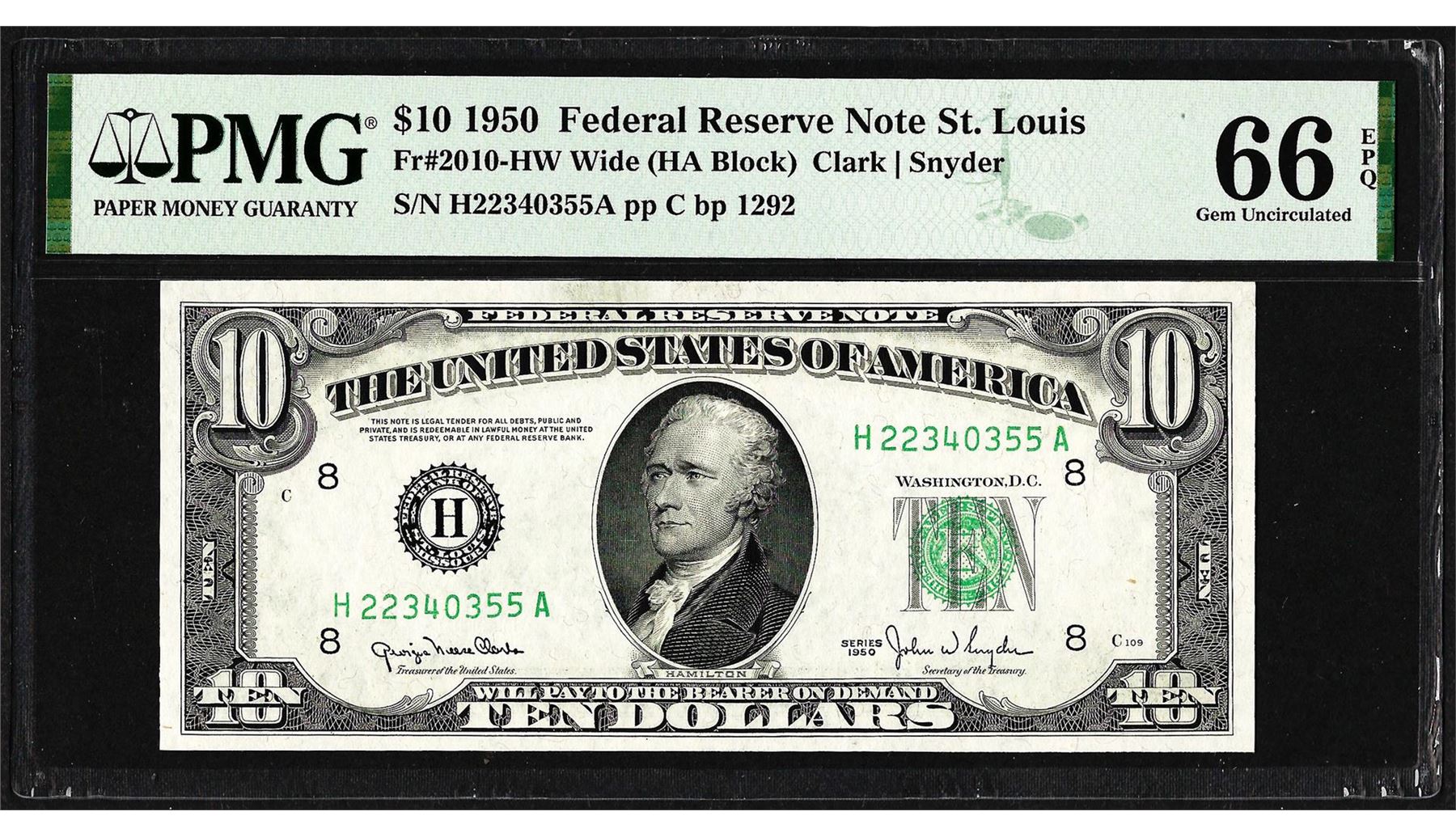 One 1950 $10 Federal Reserve Note St. Louis Fr.2010-HW Wide PMG Gem Uncirculated 66EPQ. PMG Certified.