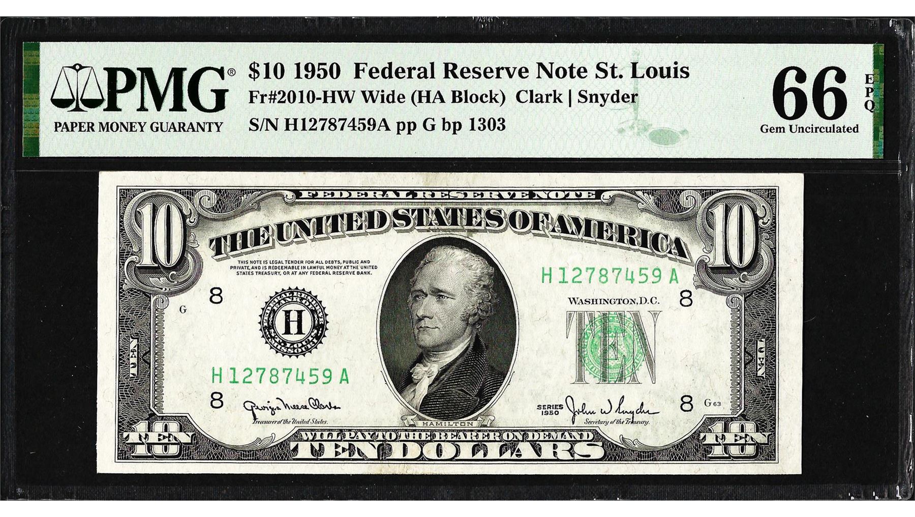 One 1950 $10 Federal Reserve Note St. Louis Fr.2010-HW Wide PMG Gem Uncirculated 66EPQ. PMG Certified.