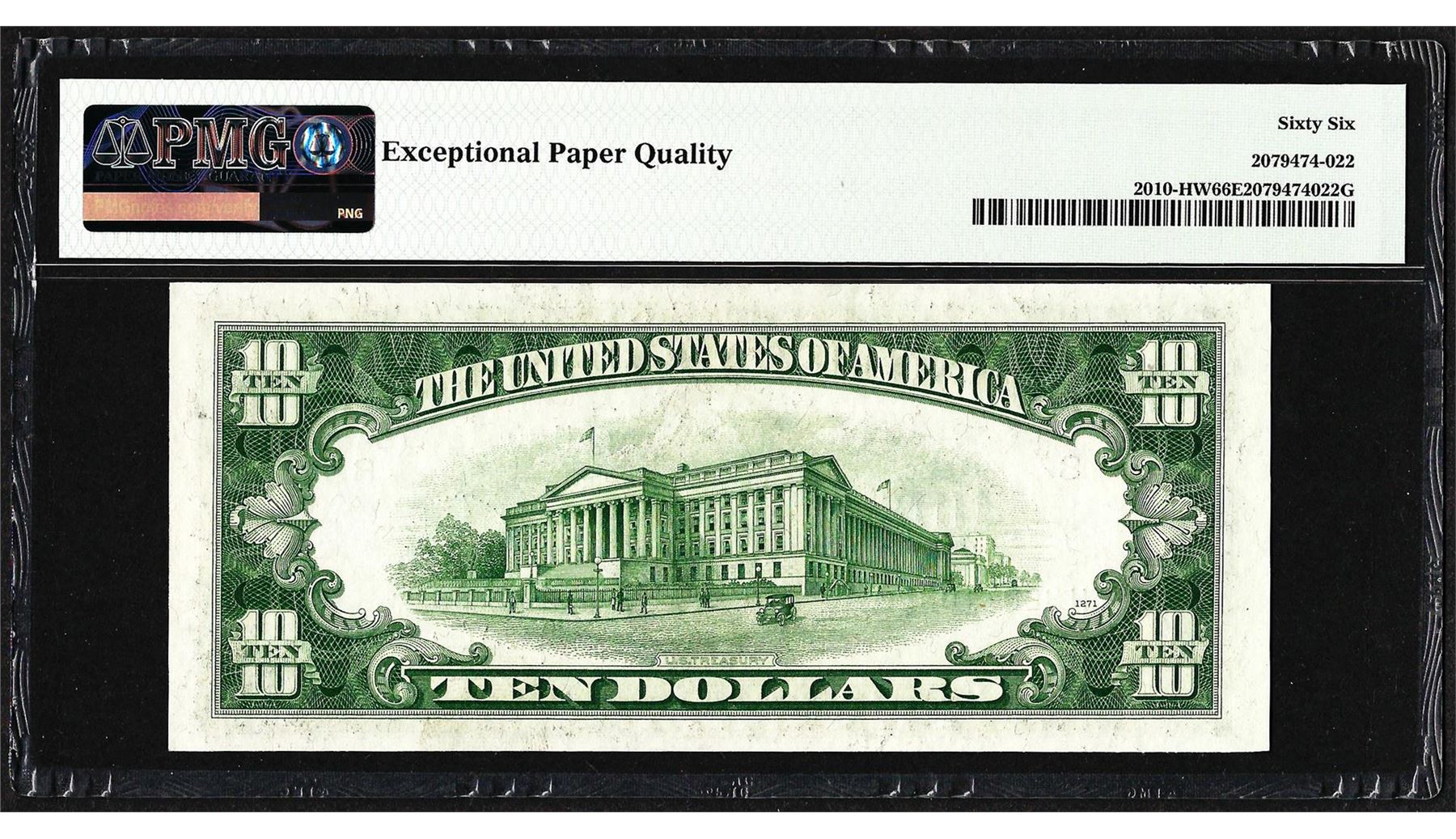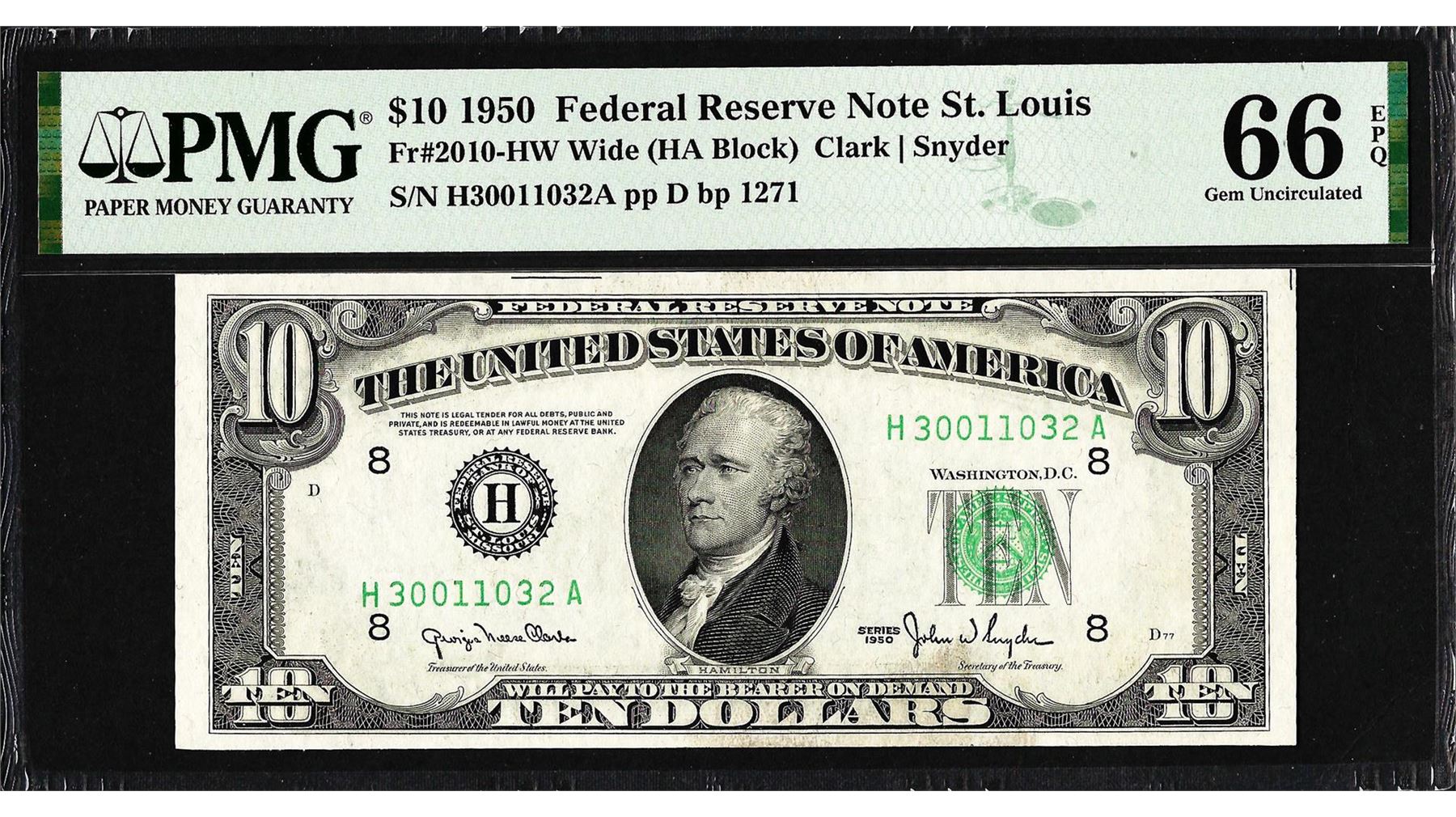 One 1950 $10 Federal Reserve Note St. Louis Fr.2010-HW Wide PMG Gem Uncirculated 66EPQ. PMG Certified.