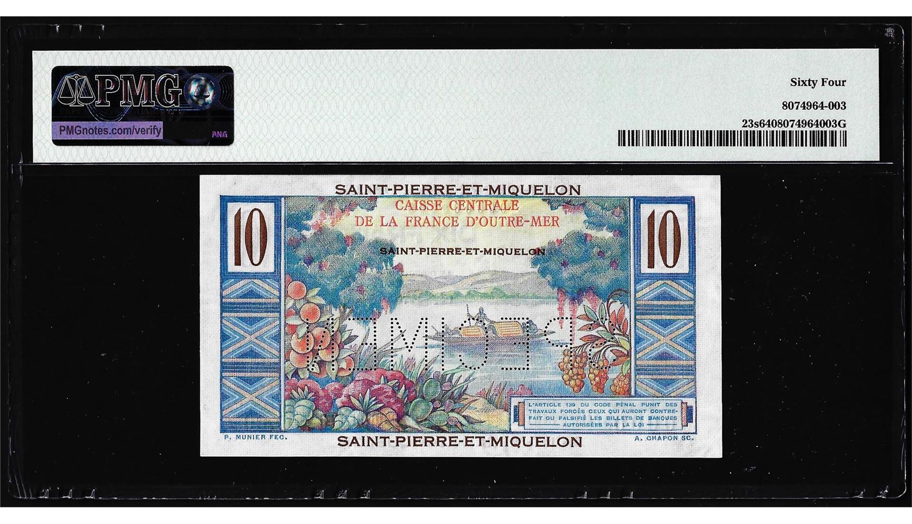 1950-1960 Saint Pierre & Miquelon 10 Francs Specimen Note Pick# 23s PMG Choice Uncirculated 64