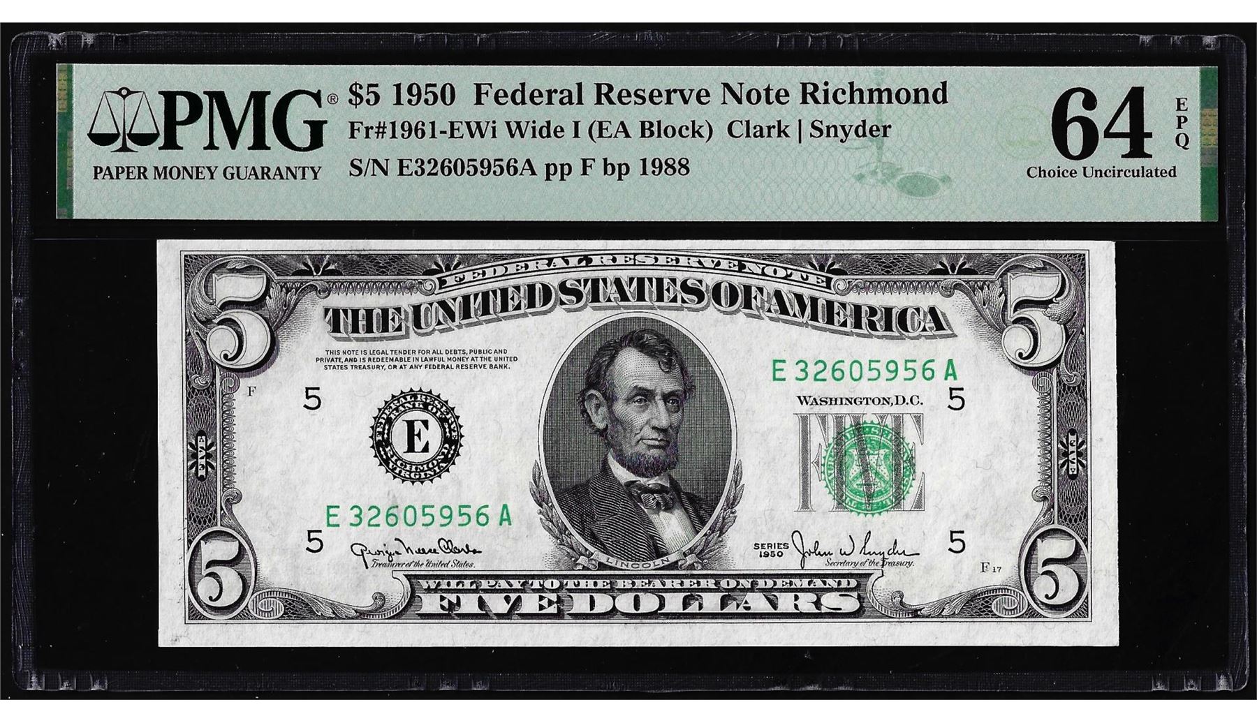 1950 $5 Federal Reserve Note Richmond Fr.1961-E Wide I PMG Choice Uncirculated 64EPQ