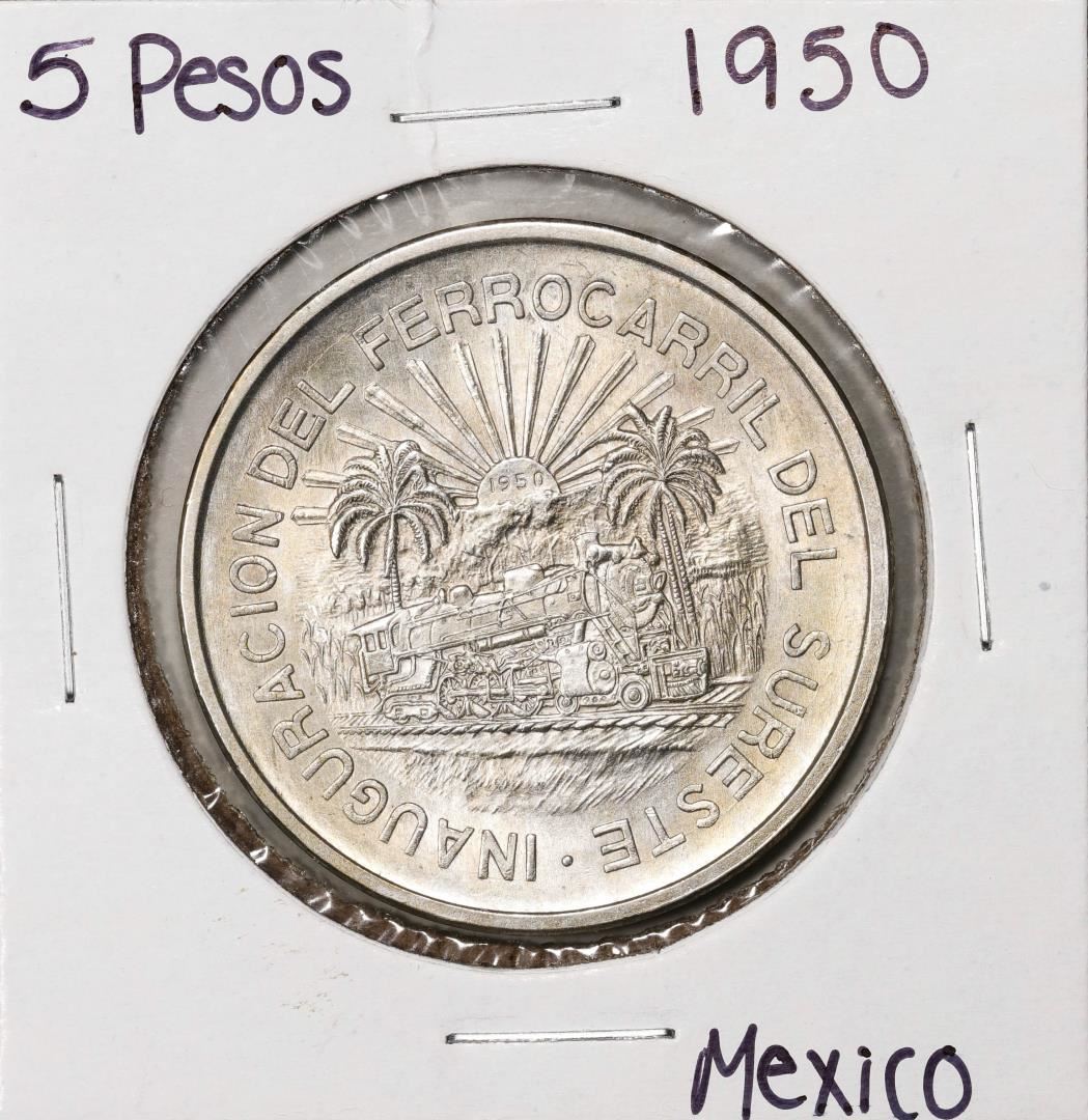 1950 Mexico 5 Pesos Inauguracion Del Ferrocarril Del Sureste Coin