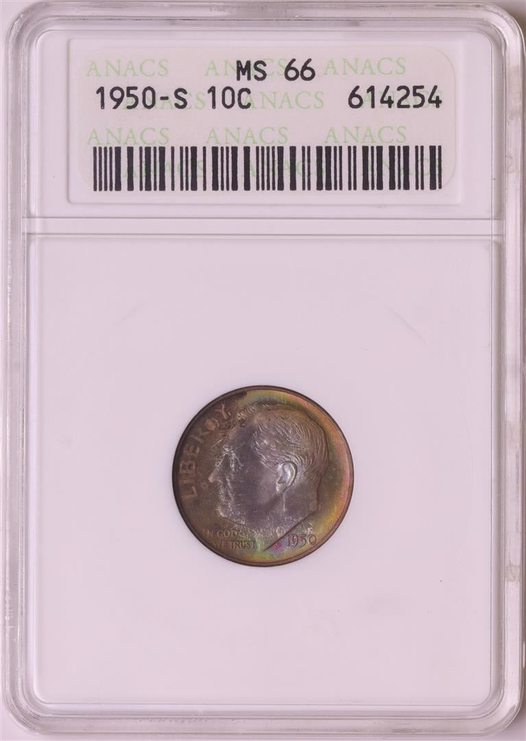 One 1950-S Roosevelt Dime Coin ANACS MS66 Amazing Toning. ANACS Certified.
