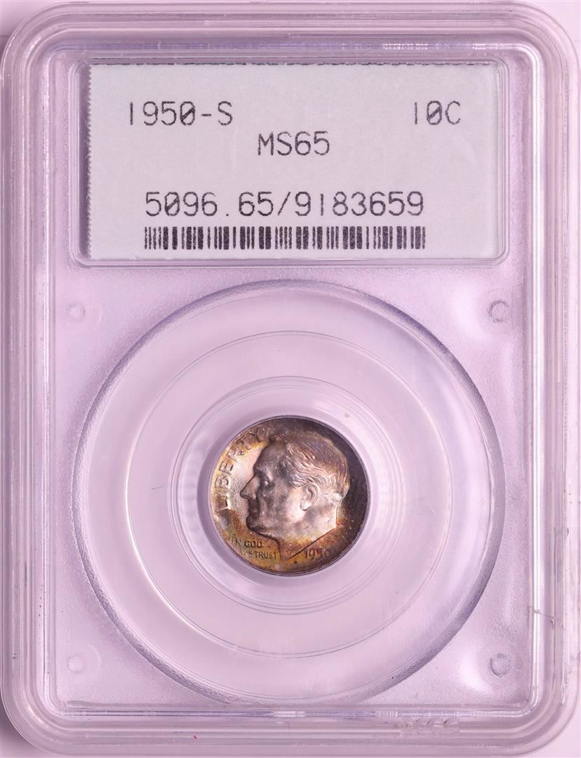 One 1950-S Roosevelt Dime Coin PCGS MS65 Amazing Toning. PCGS Graded.