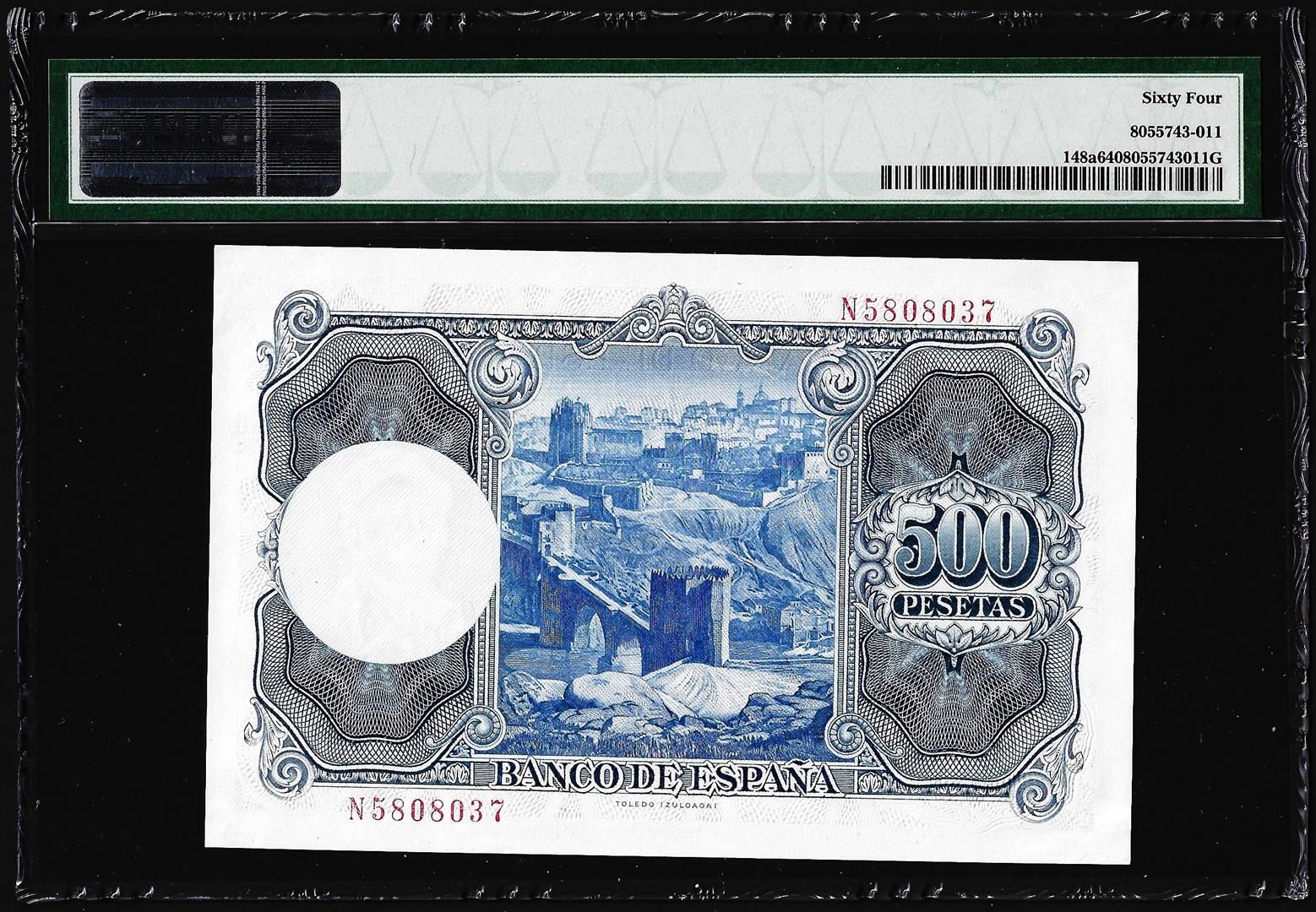 One 1950's Spain Banco de Espana 500 Pesetas Note Pick# 148a PMG Choice Uncirculated 64. PMG Certified.