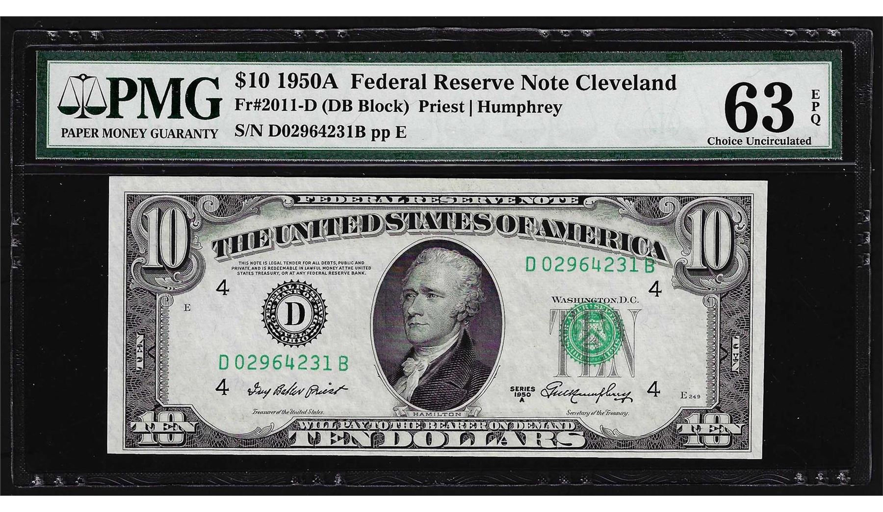 One 1950A $10 Federal Reserve Note Cleveland Fr. 2011-D PMG Choice Uncirculated 63EPQ. PMG Certified.
