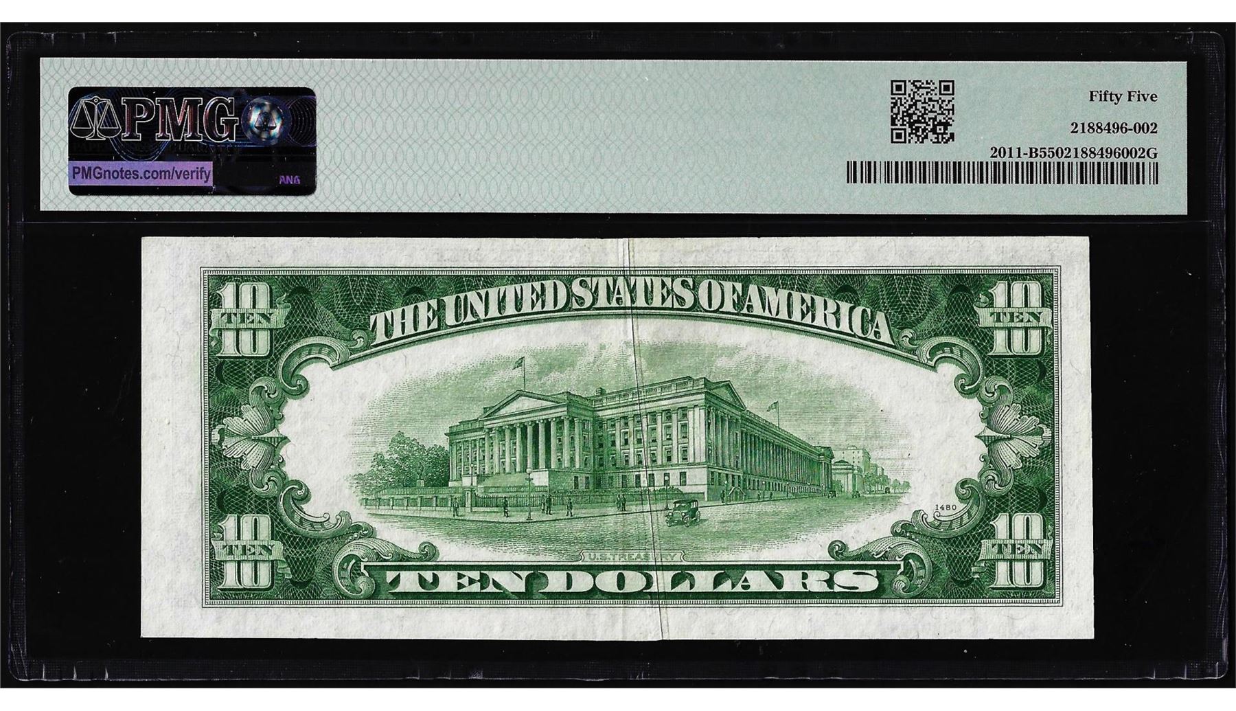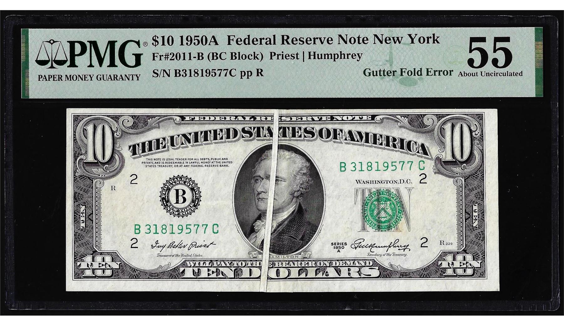 One 1950A $10 Federal Reserve Note Fr.2011-B Gutter Fold ERROR PMG About Uncirculated 55. PMG Certified.