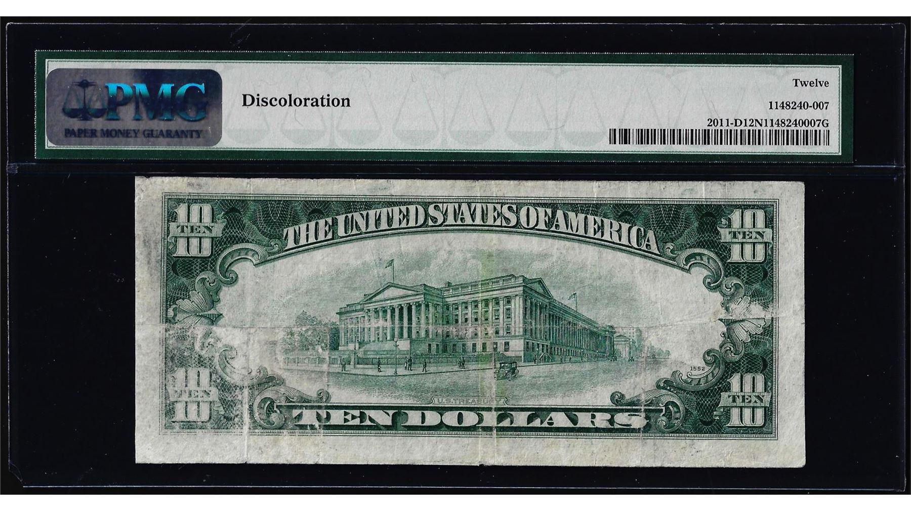One 1950A $10 Federal Reserve Note Mismatched Serial Number Error Fr.2011-D PMG Fine 12 Net. PMG Certified.