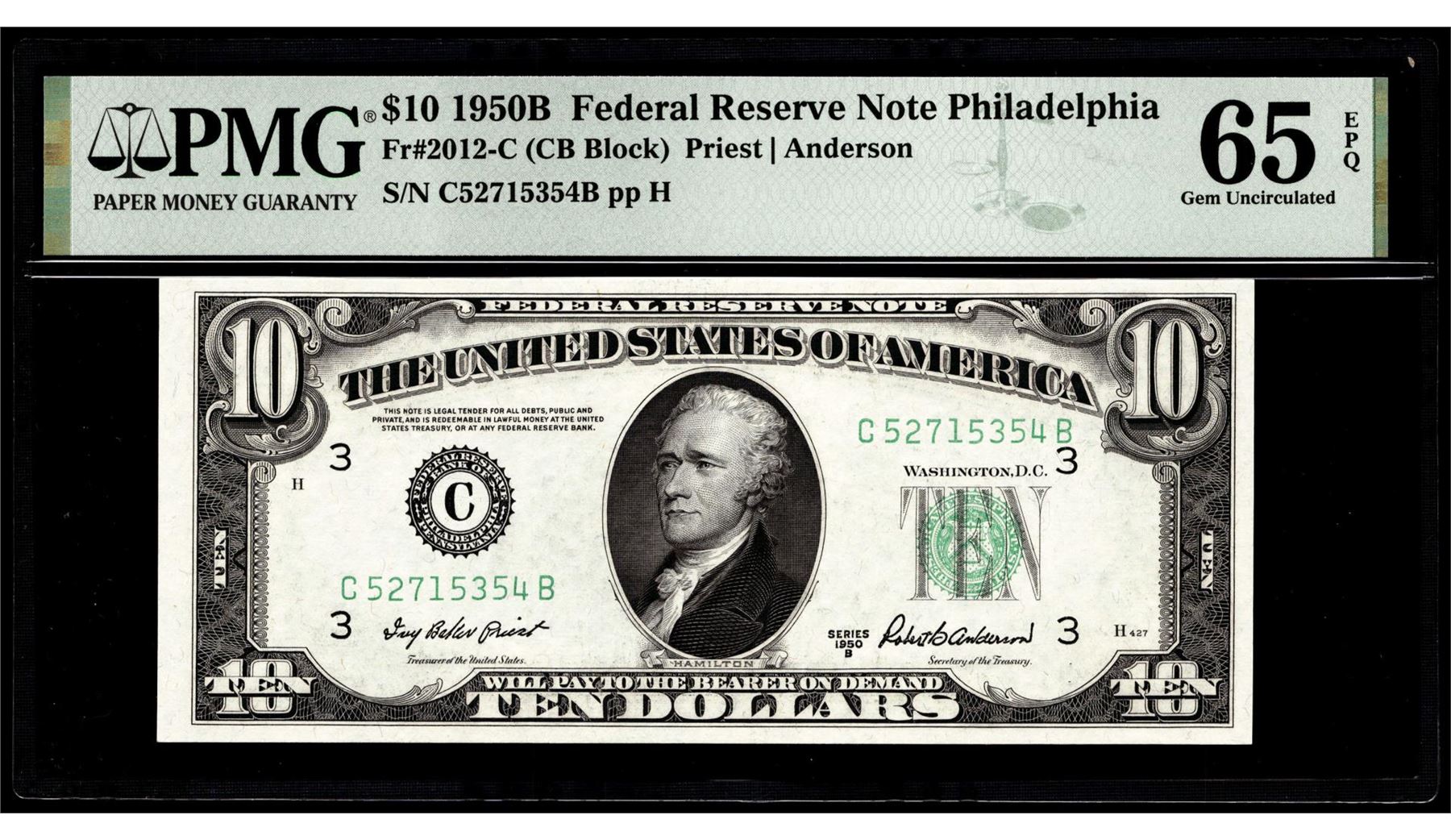 One 1950B $10 Federal Reserve Note Philadelphia Fr.2012-C PMG Gem Uncirculated 65EPQ. PMG Certified.