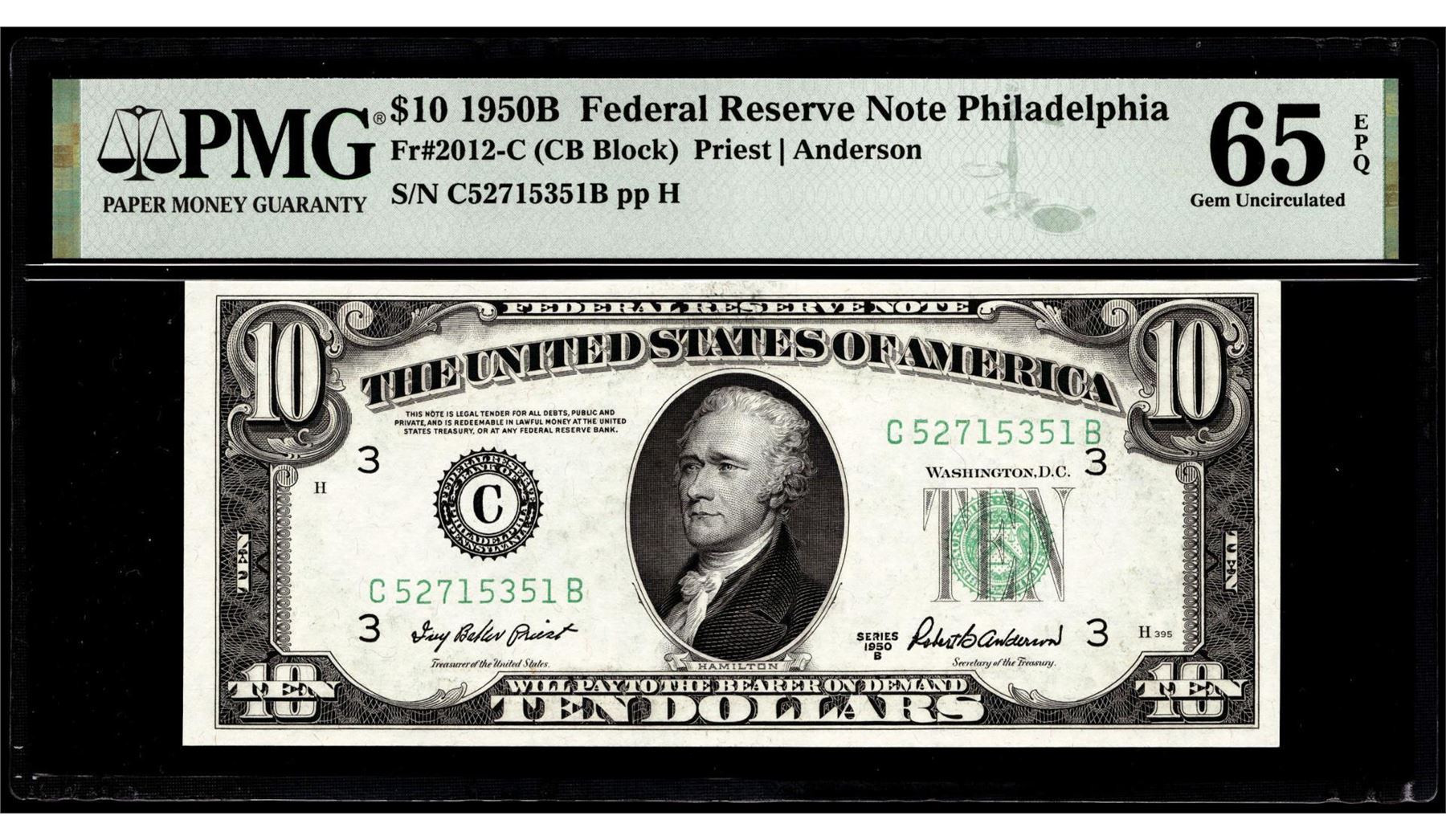One 1950B $10 Federal Reserve Note Philadelphia Fr.2012-C PMG Gem Uncirculated 65EPQ. PMG Certified.