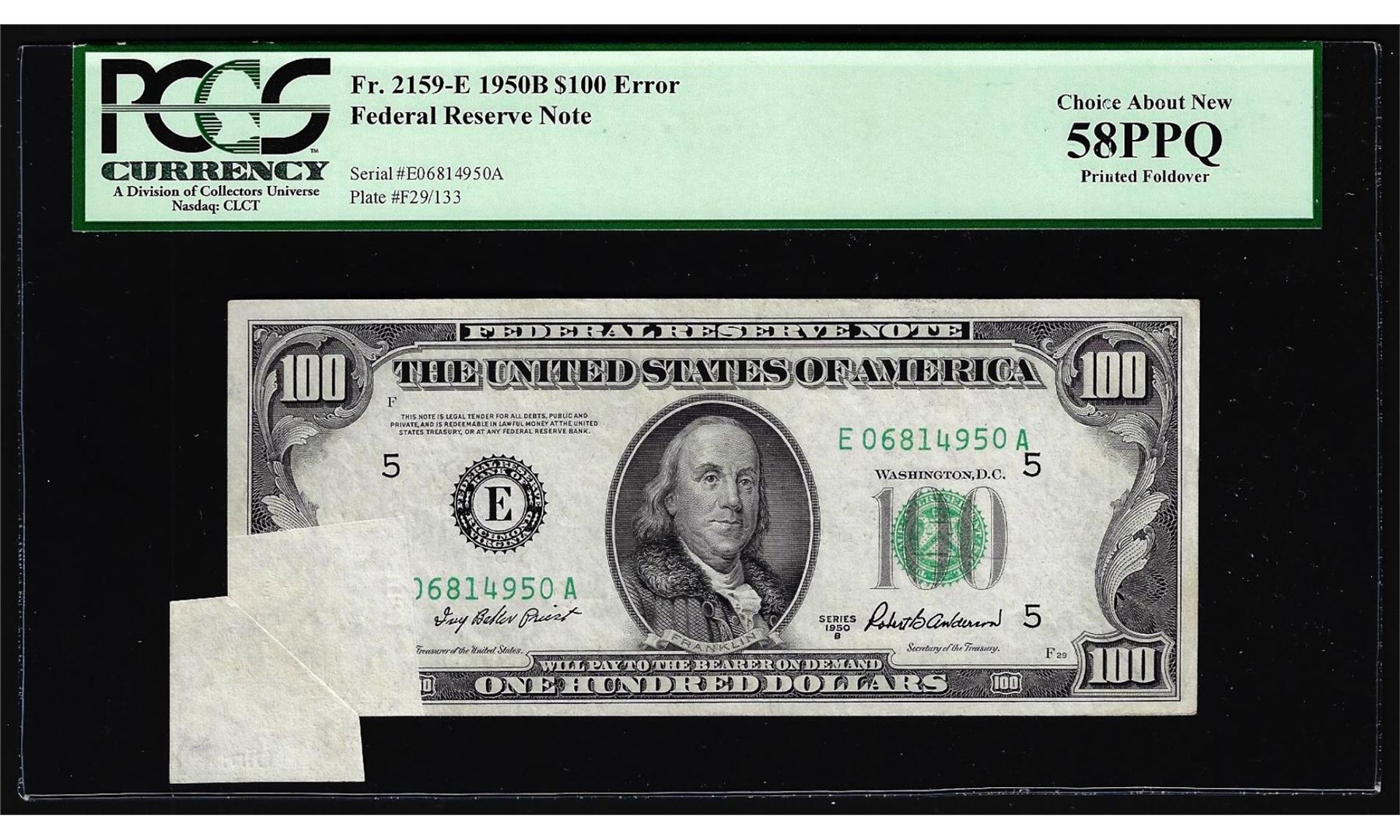 One 1950B $100 Federal Reserve Note Richmond Fold over Error PCGS Choice About New 58PPQ. PCGS Graded.