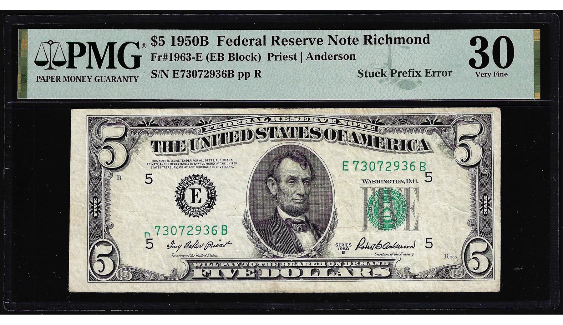 One 1950B $5 Federal Reserve Note Richmond Stuck Prefix Error Fr.1963-E PMG Very Fine 30. PMG Certified.