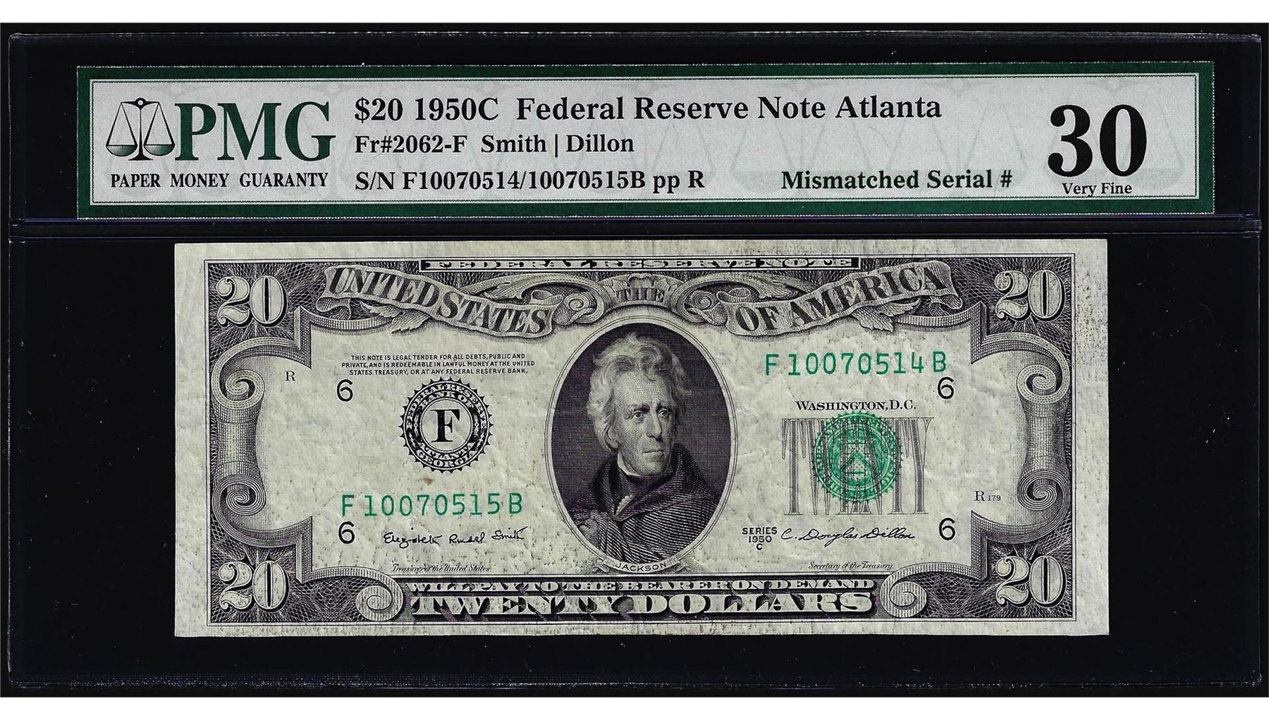 One 1950C $20 Federal Reserve Note Mismatched Serial Number ERROR PMG Very Fine 30. PMG Certified.
