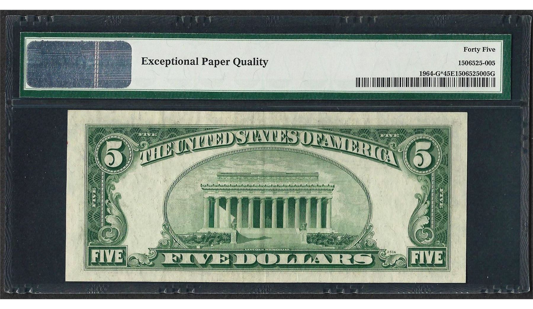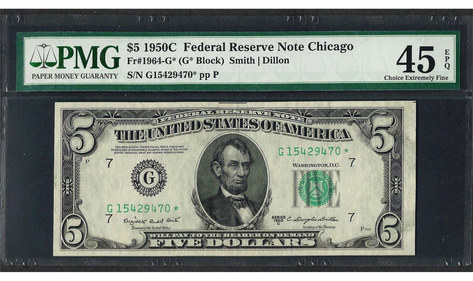 One 1950C $5 Federal Reserve STAR Note Chicago Fr.1964-G* PMG Choice Extremely Fine 45EPQ. PMG Certified.