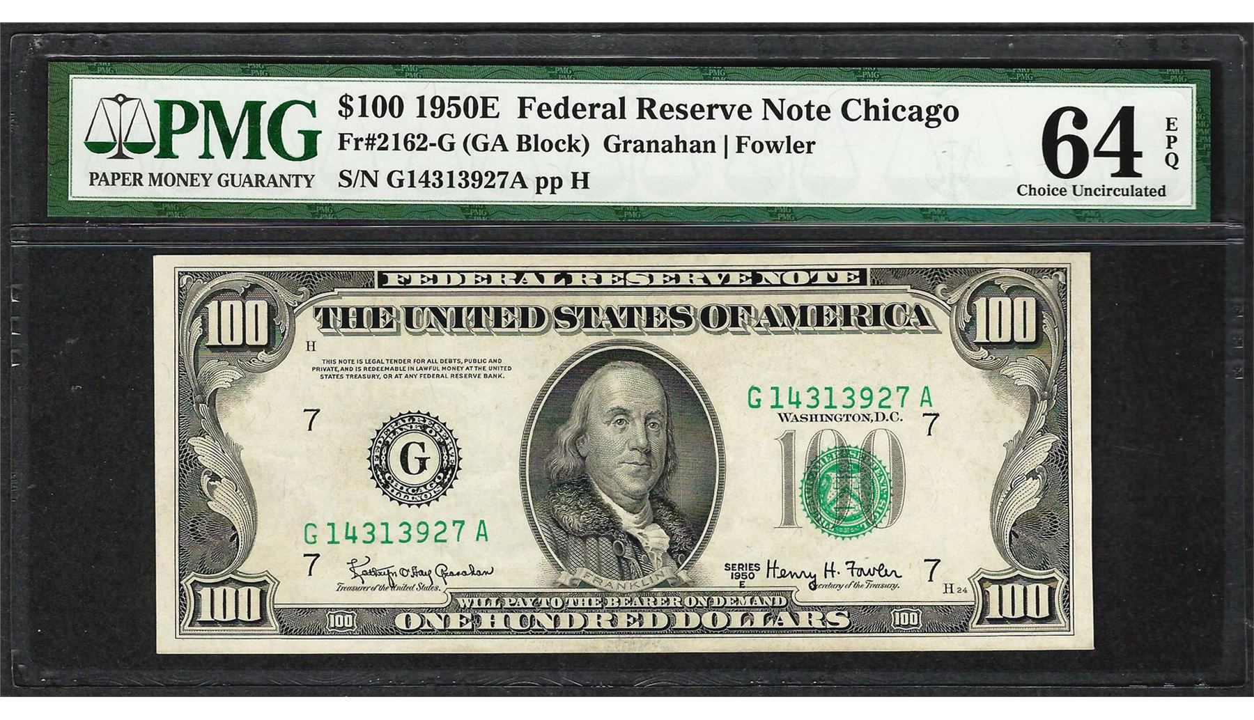 One 1950E $100 Federal Reserve Note Chicago Fr.2162-G PMG Choice Uncirculated 64EPQ. PMG Certified.
