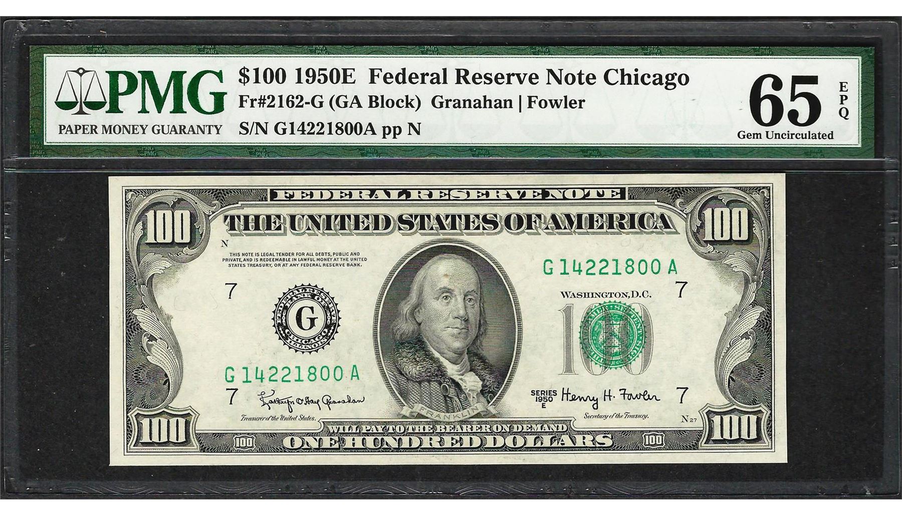 One 1950E $100 Federal Reserve Note Chicago Fr.2162-G PMG Gem Uncirculated 65EPQ. PMG Certified.