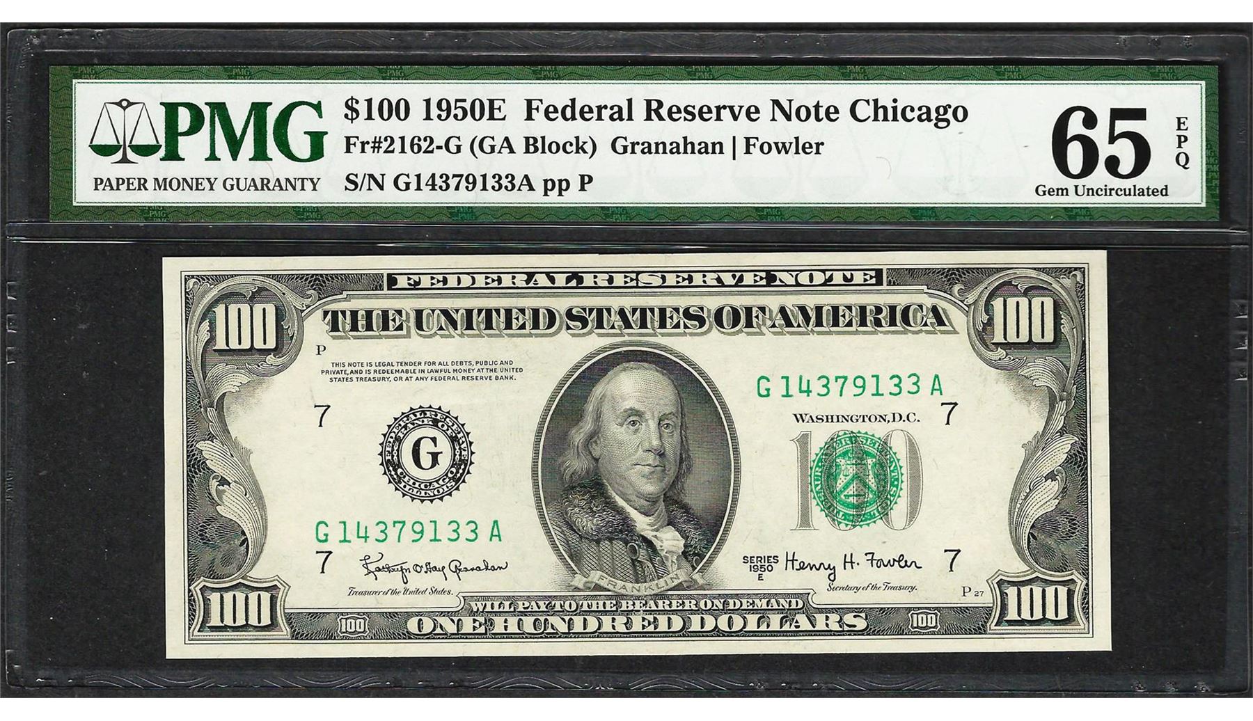 One 1950E $100 Federal Reserve Note Chicago Fr.2162-G PMG Gem Uncirculated 65EPQ. PMG Certified.