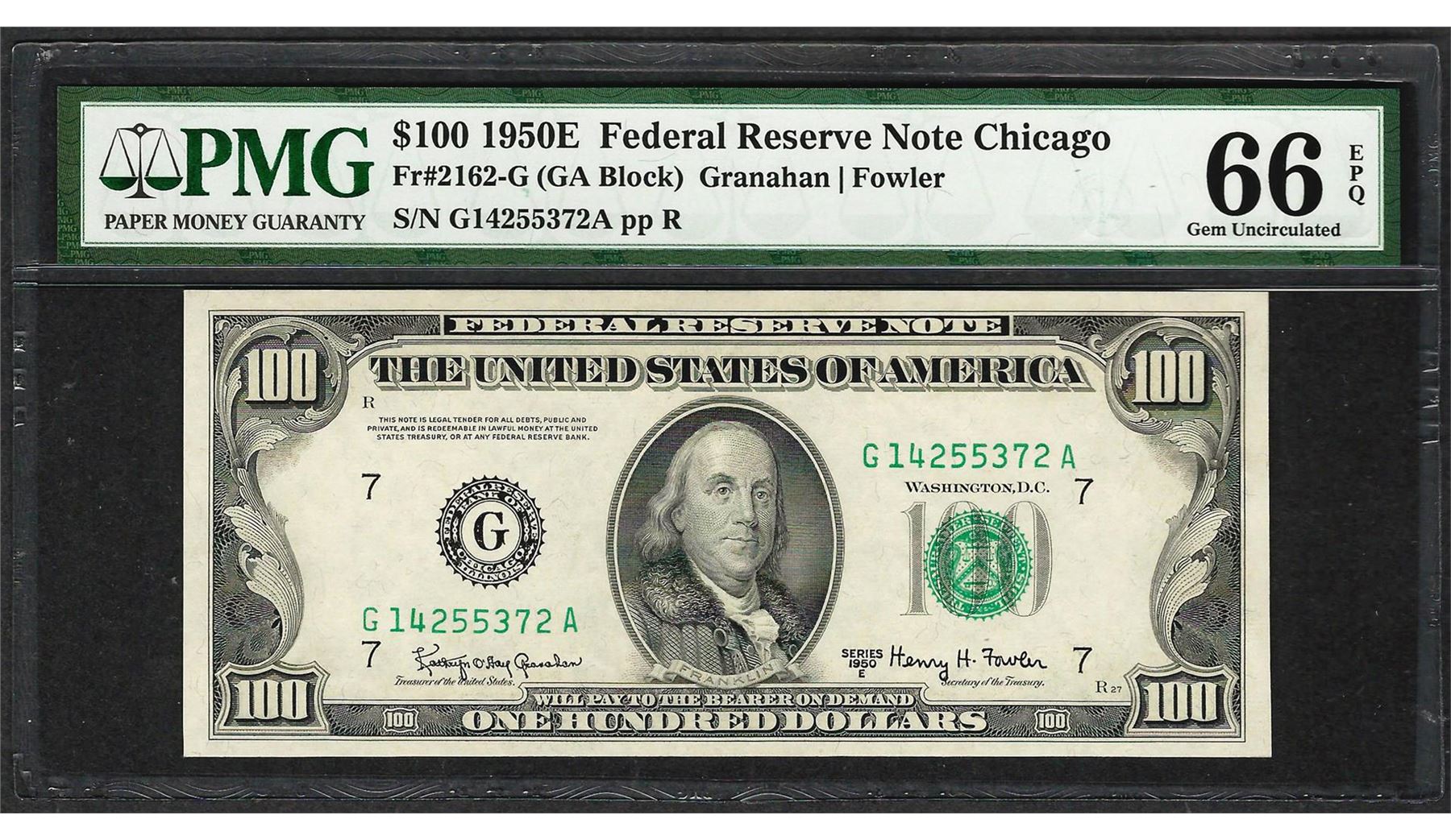 One 1950E $100 Federal Reserve Note Chicago Fr.2162-G PMG Gem Uncirculated 66EPQ. PMG Certified.