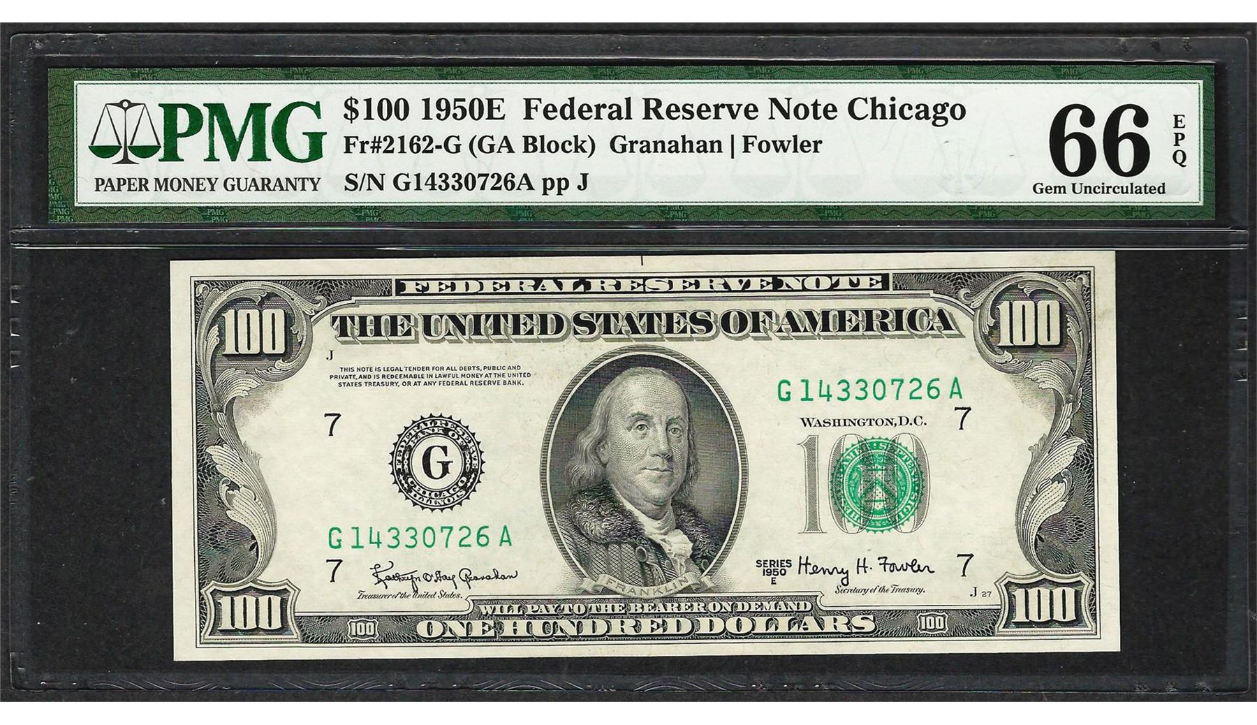 One 1950E $100 Federal Reserve Note Chicago Fr.2162-G PMG Gem Uncirculated 66EPQ. PMG Certified.