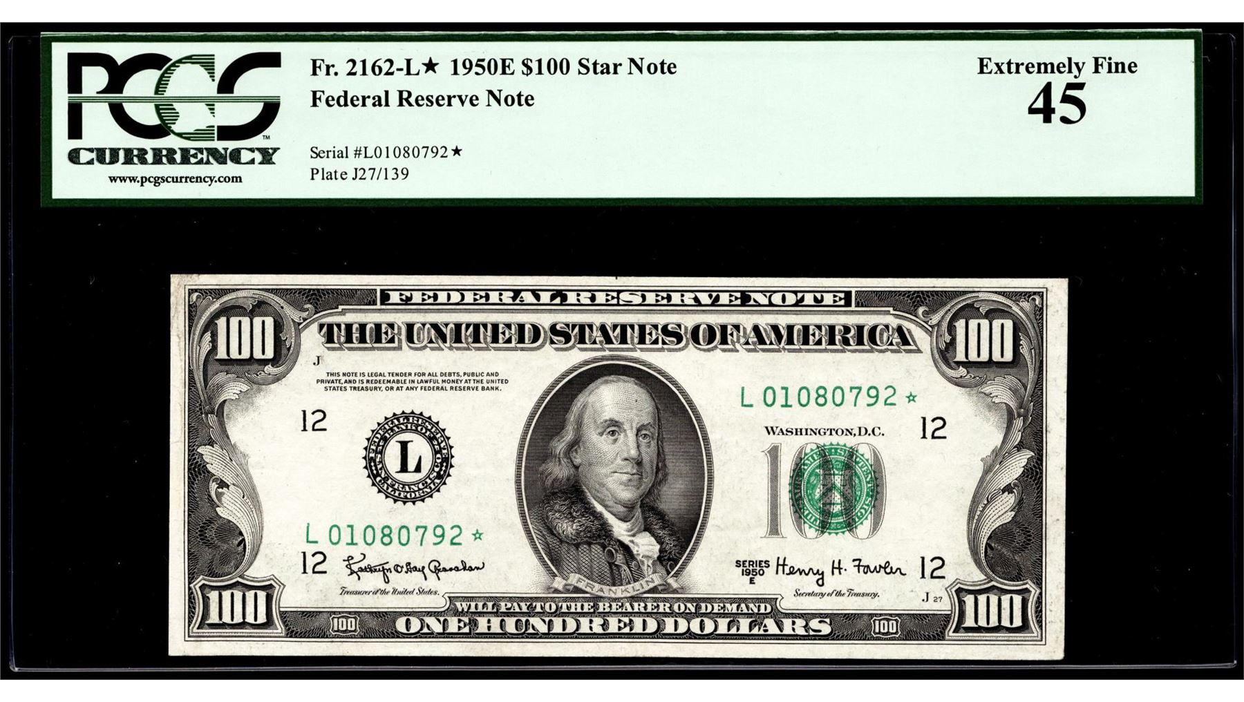 One 1950E $100 Federal Reserve STAR Note San Francisco Fr.2162-L* PCGS Extremely Fine 45. PCGS Graded.