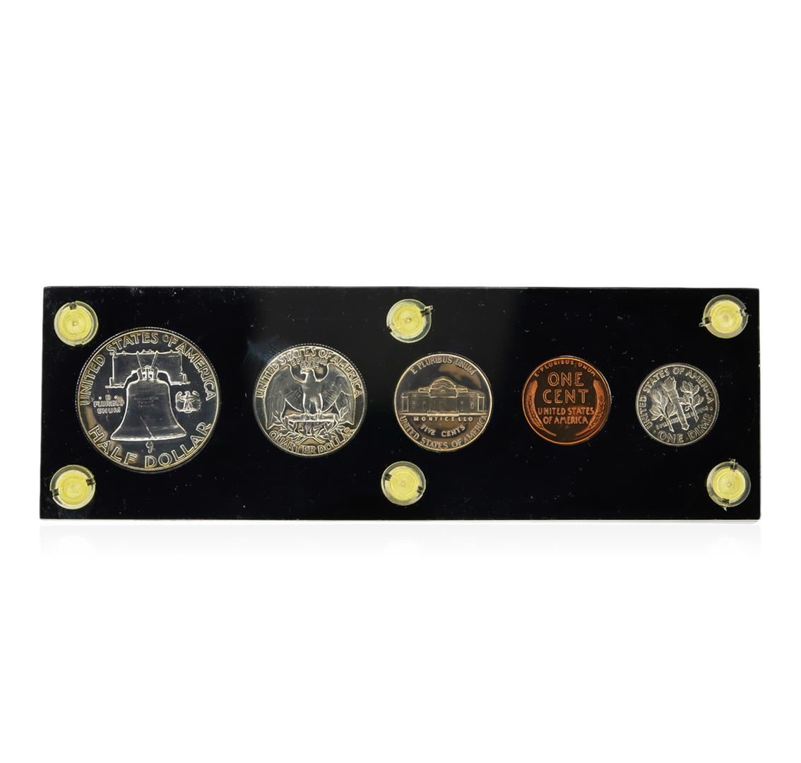 This 1951 (5) Coin Proof Set includes the following coins: 1951 Franklin Half Dollar, 1951 Washington Quarter, 1951 Roosevelt Dime, 1951 Jefferson Nickel, and a 1951 Lincoln Wheat Cent.