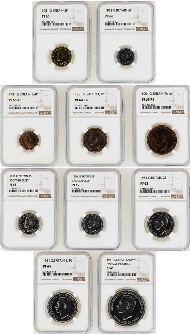 One 1951 Great Britain (10) Coin Proof Set NGC Graded PF63-66. NGC Certified.