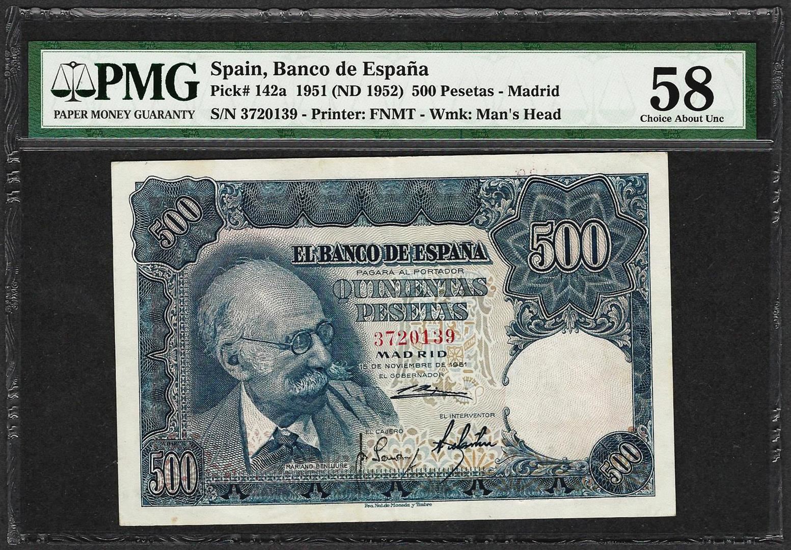 One 1951 Spain Banco de Espana 500 Pesetas Note Pick# 142a PMG Choice About Unc 58. PMG Certified.