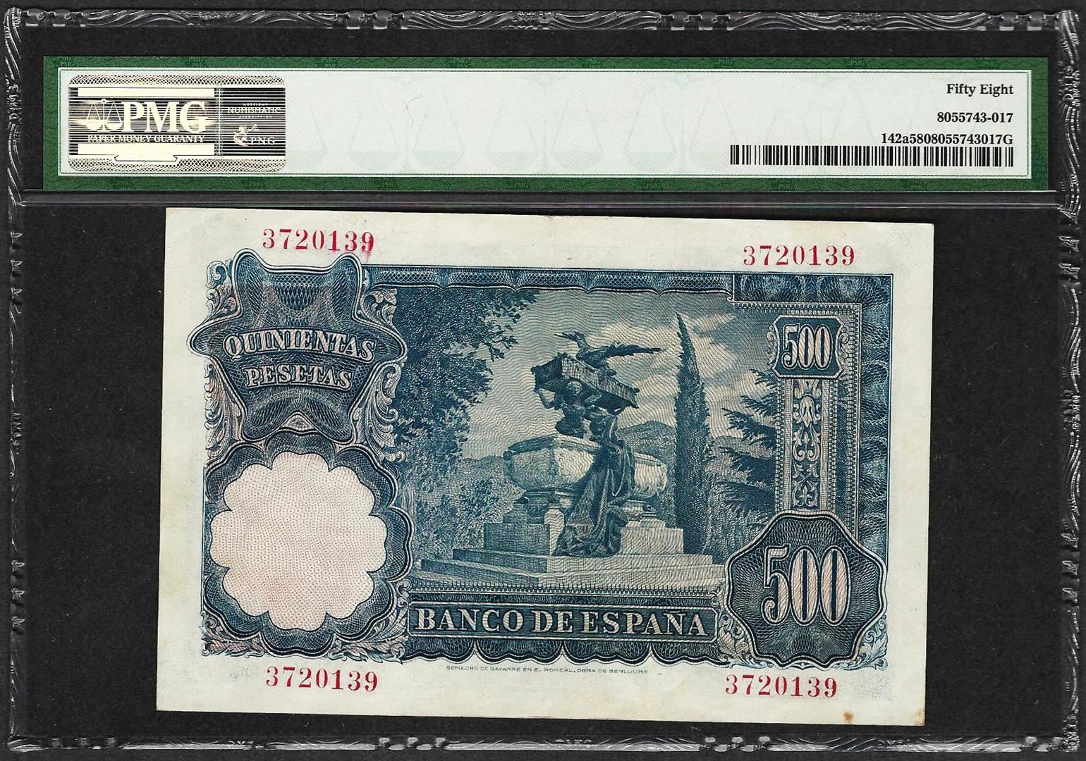 One 1951 Spain Banco de Espana 500 Pesetas Note Pick# 142a PMG Choice About Unc 58. PMG Certified.