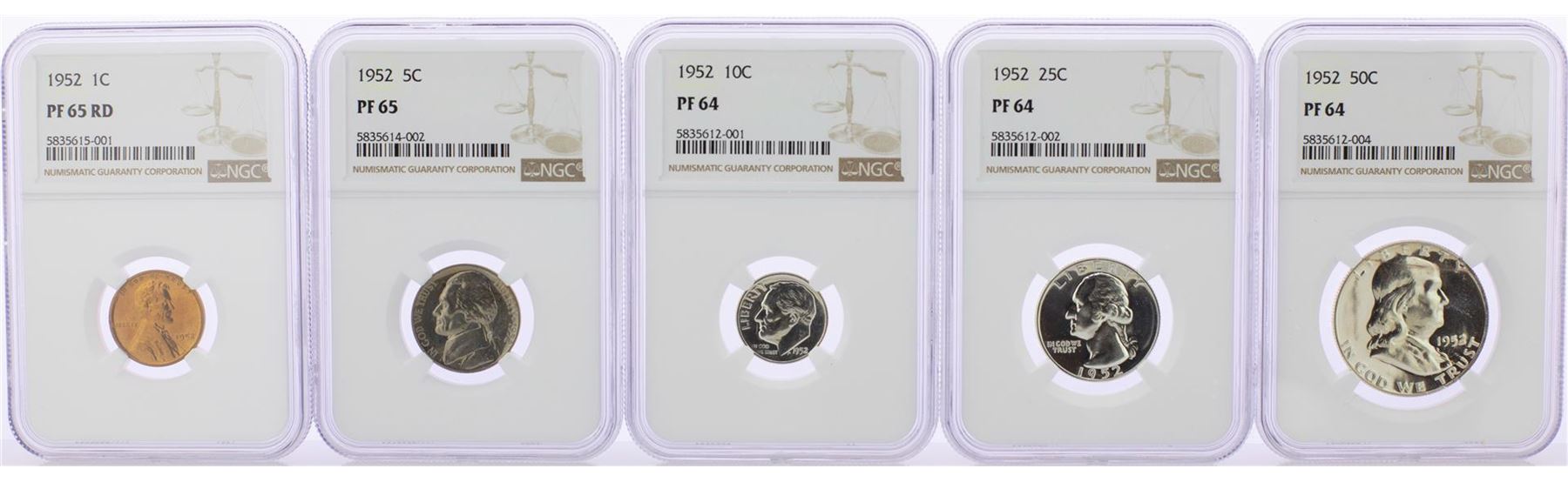 One 1952 (5) Coin Proof Set NGC Graded PF64/PR65/PF65RD. NGC Certified.
