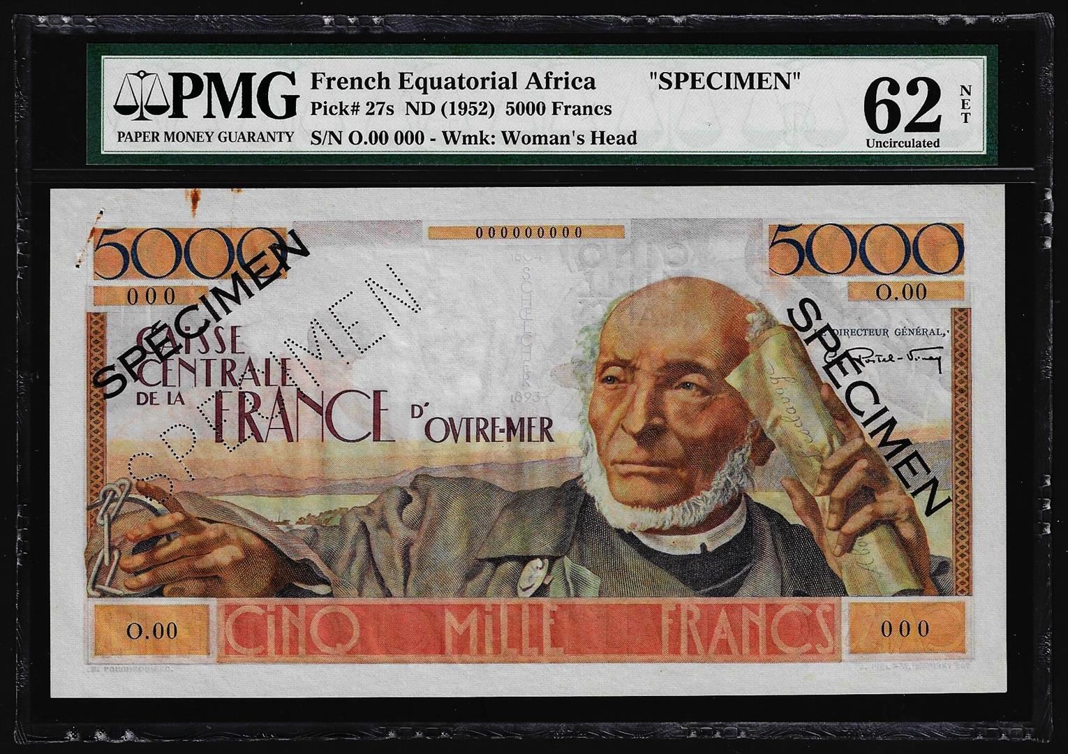1952 French Equatorial Africa 5000 Francs Specimen Note Pick # 27s PMG Uncirculated 62 Net