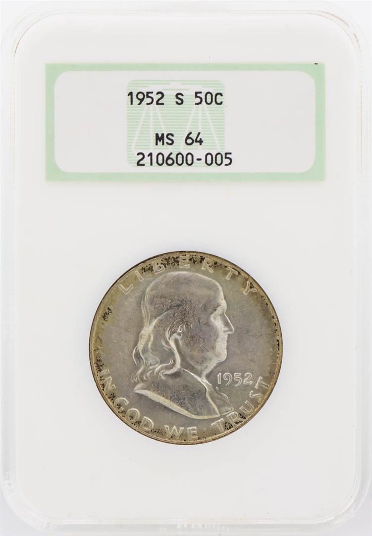 One 1952-S Franklin Half Dollar Coin NGC Graded MS64. NGC Certified.