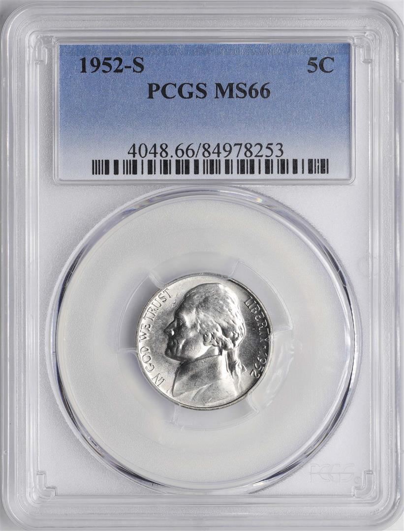 One 1952-S Jefferson Nickel Coin PCGS MS66. PCGS Graded.