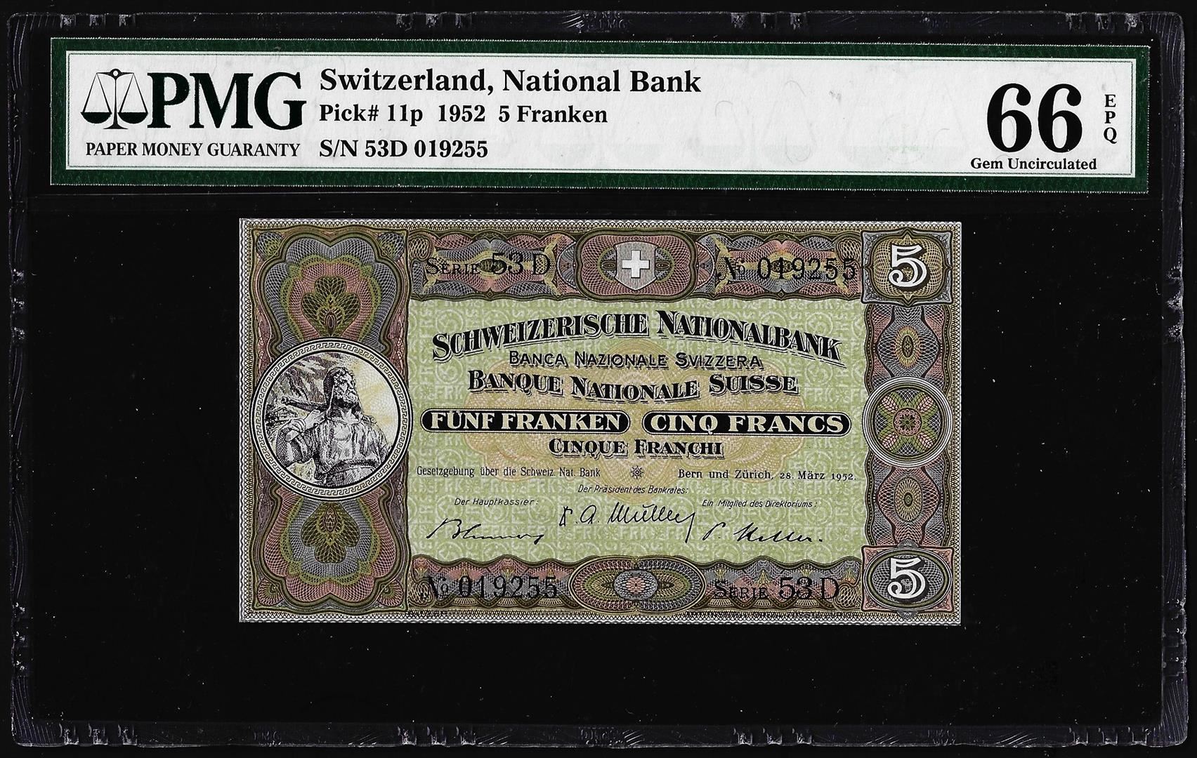 One 1952 Switzerland 5 Franken Note Pick# 11p PMG Gem Uncirculated 66EPQ. PMG Certified.