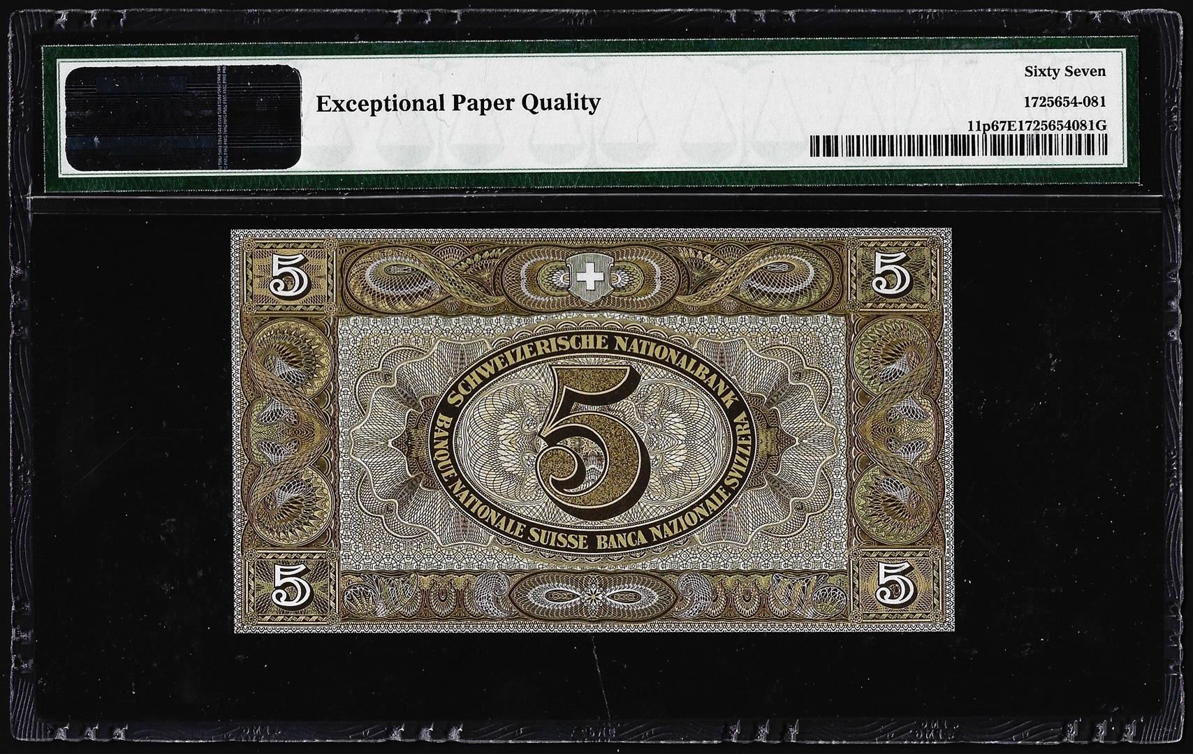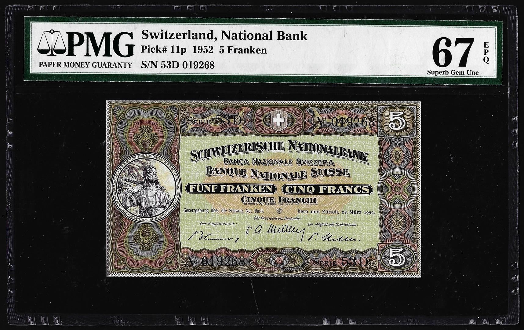 One 1952 Switzerland 5 Franken Note Pick# 11p PMG Superb Gem Uncirculated 67EPQ. PMG Certified.