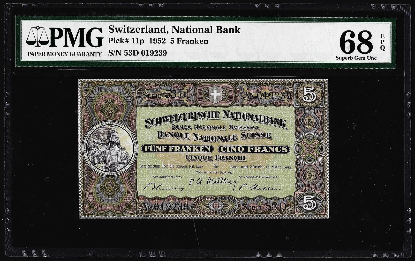 One 1952 Switzerland 5 Franken Note Pick# 11p PMG Superb Gem Uncirculated 68EPQ. PMG Certified.