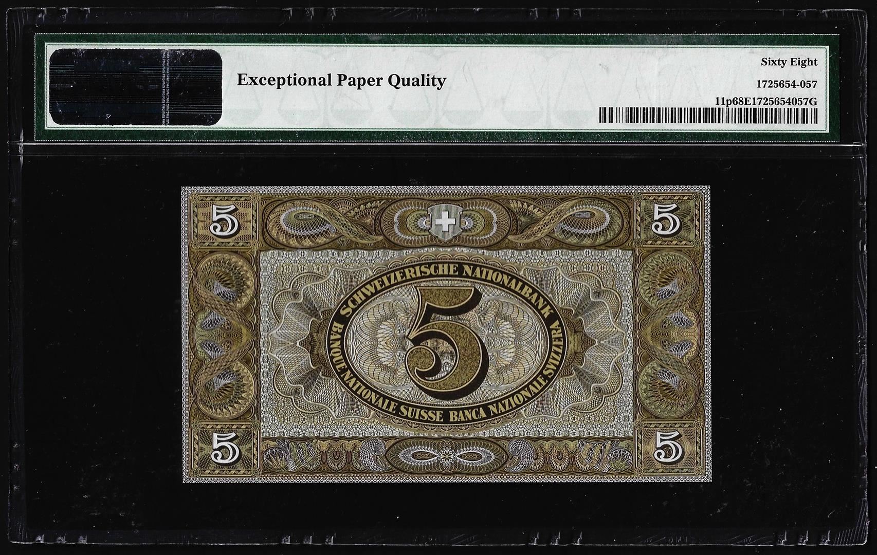 One 1952 Switzerland 5 Franken Note Pick# 11p PMG Superb Gem Uncirculated 68EPQ. PMG Certified.