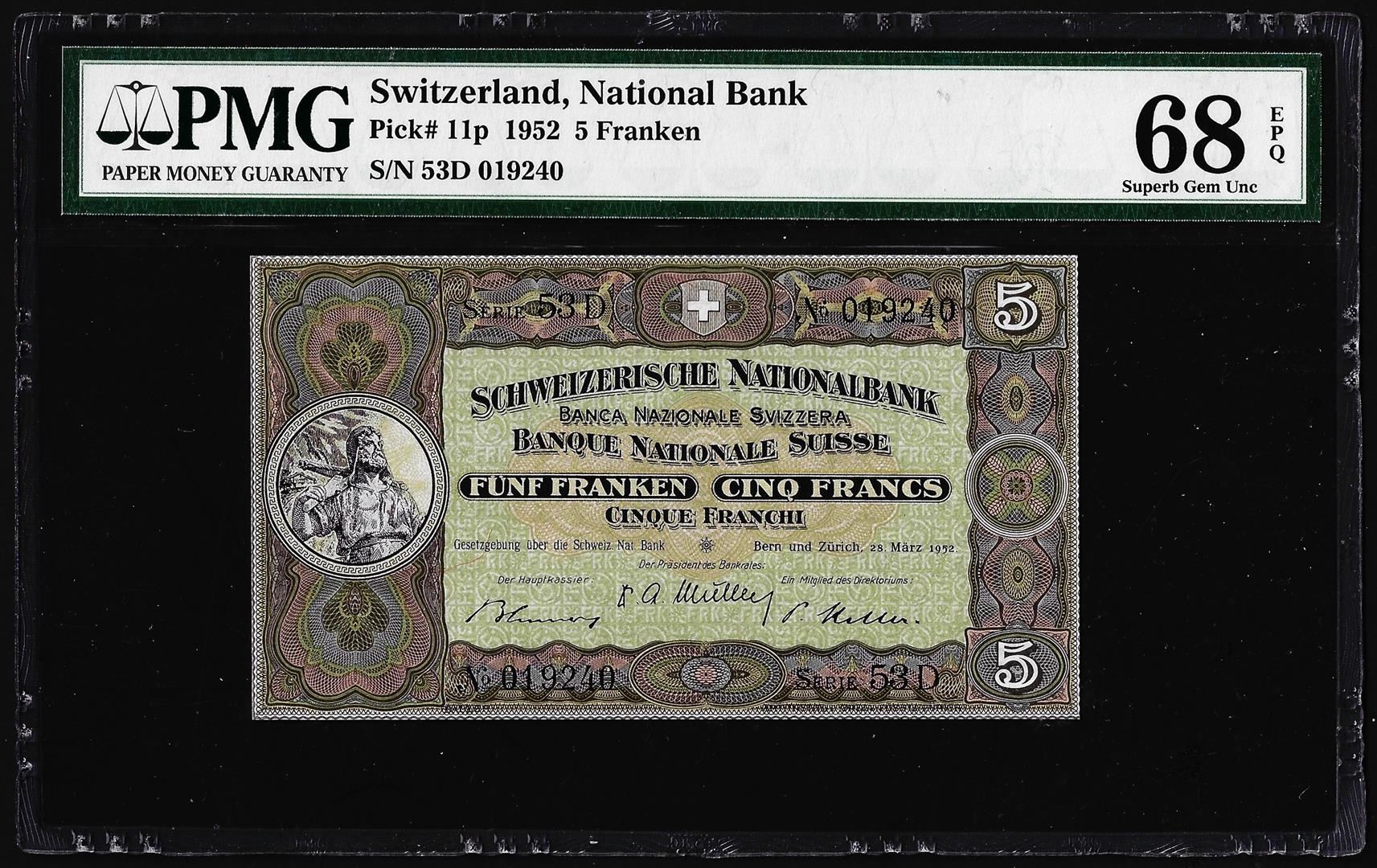 One 1952 Switzerland 5 Franken Note Pick# 11p PMG Superb Gem Uncirculated 68EPQ. PMG Certified.