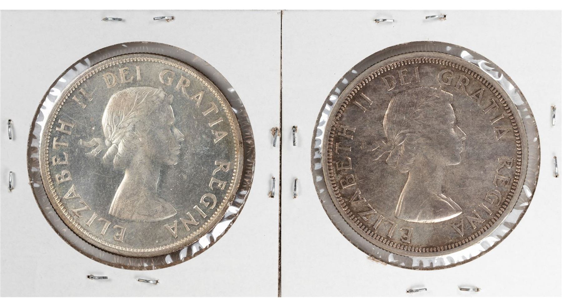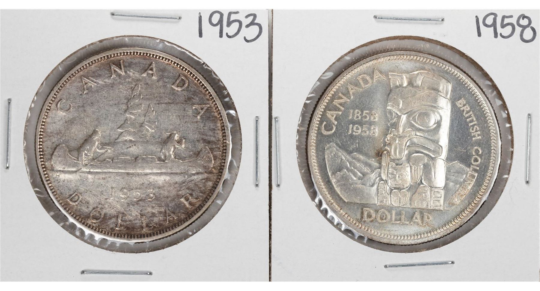 One 1953 & 1958 $1 Canada Silver Dollar Coins.