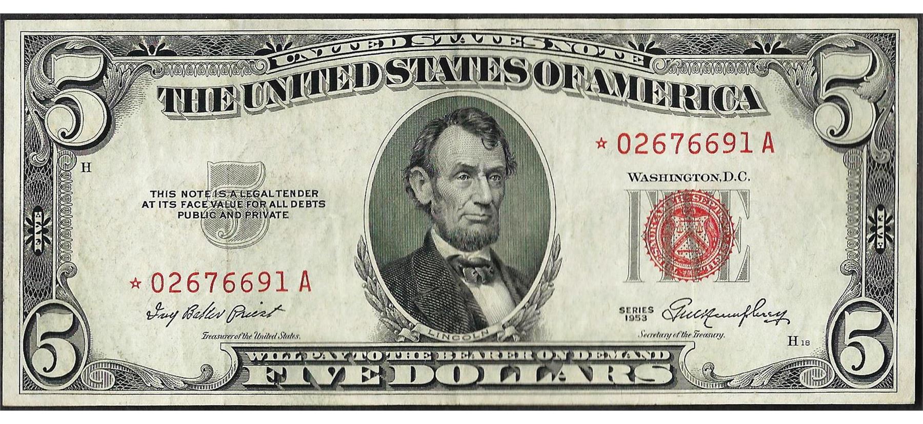 One 1953 $5 Legal Tender STAR Note.