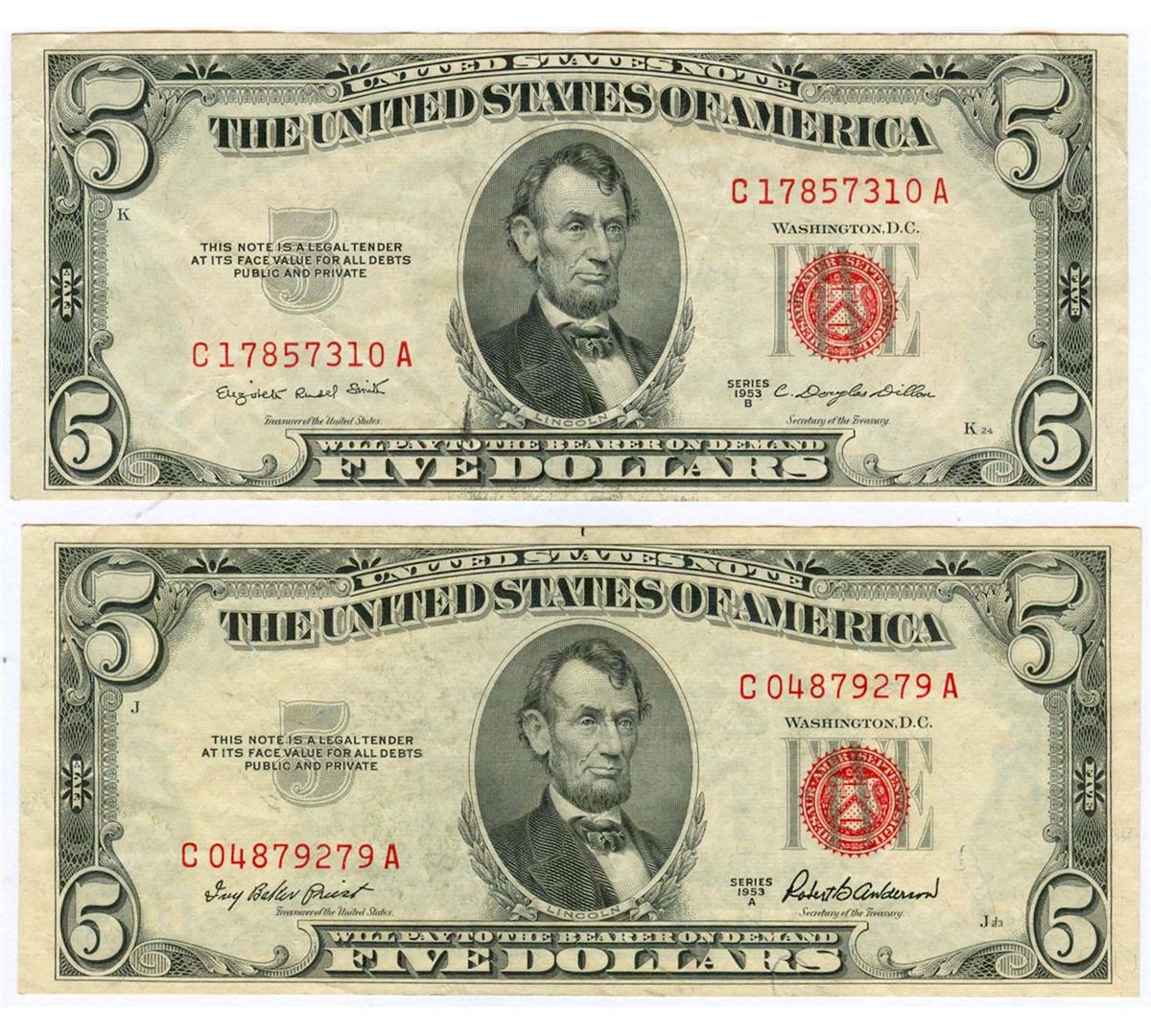 One 1953 $5 Red Seal Note Lot of 2.